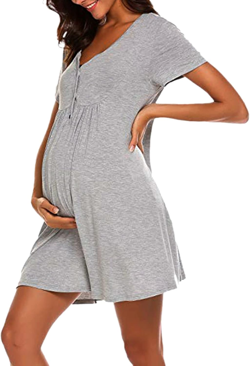 Schwanger und trotzdem total stylisch! Dieses Umstandskleid von HAPPY MAMA sitzt wie angegossen in jeder Phase deiner Schwangerschaft. Aus weichem Viskosejersey mit dehnbarem Wickeldesign und elastischer Empire-Taille über dem Bauch. Der V-Ausschnitt betont deine weiblichen Kurven, während die reguläre Passform genug Platz für deinen wachsenden Babybauch lässt. Länge ca. 90-96 cm, Ärmellänge ca. 10 cm - perfekt für Büro, Freizeit oder besondere Anlässe. Verfügbar in verschiedenen Größen von 36-50. Fühl dich wohl und schön in deiner Schwangerschaft mit diesem vielseitigen Kleid, das zu jedem Anlass passt!
