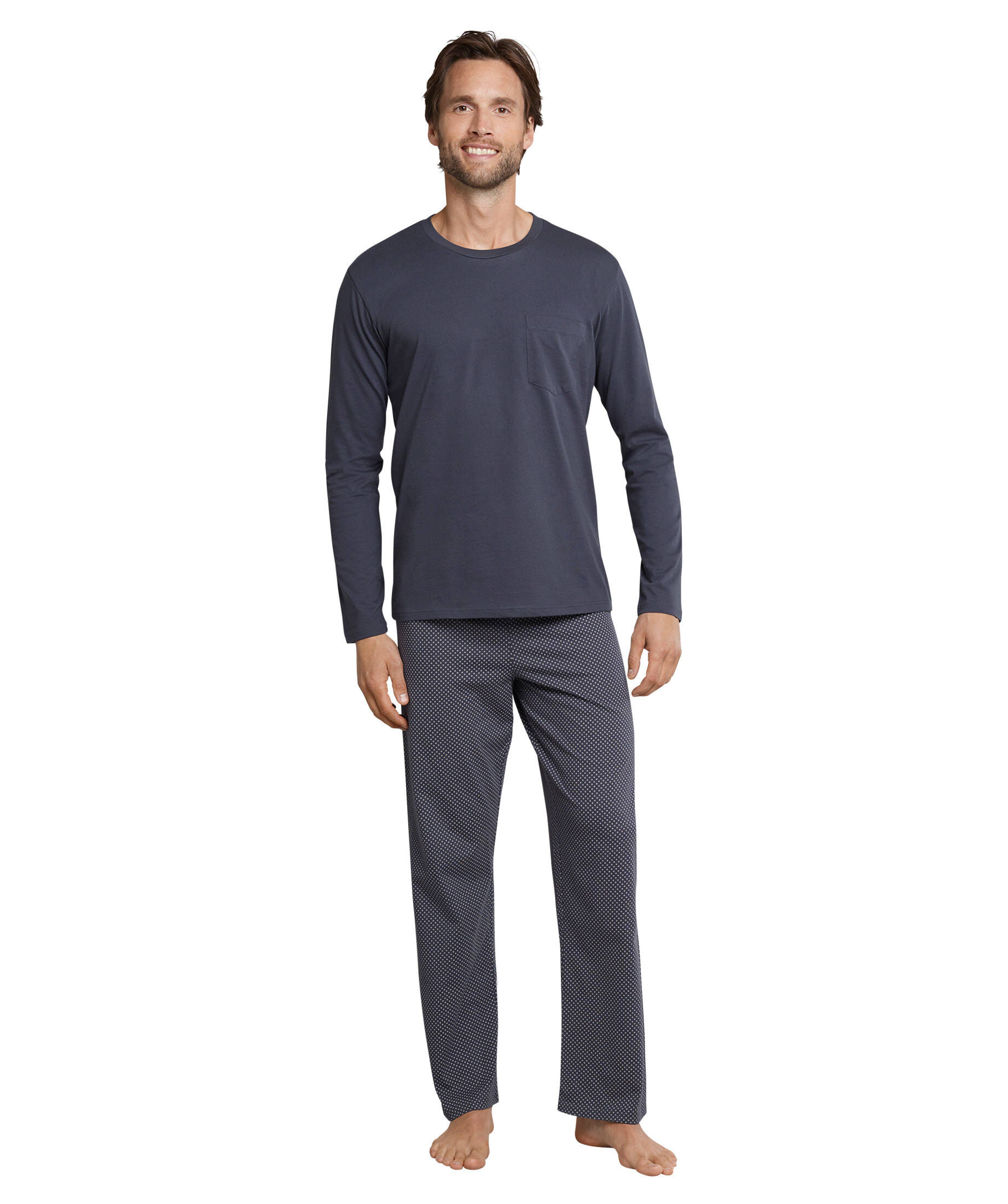 Mit praktischen Taschen und klassischem Rundhalsausschnitt ist dieser Pyjama genau das, was man sich für gemütliche Abende zuhause wünscht. Die Langarm-Ausführung hält im Winter schön warm, während die Baumwolle im Sommer angenehm kühl bleibt.