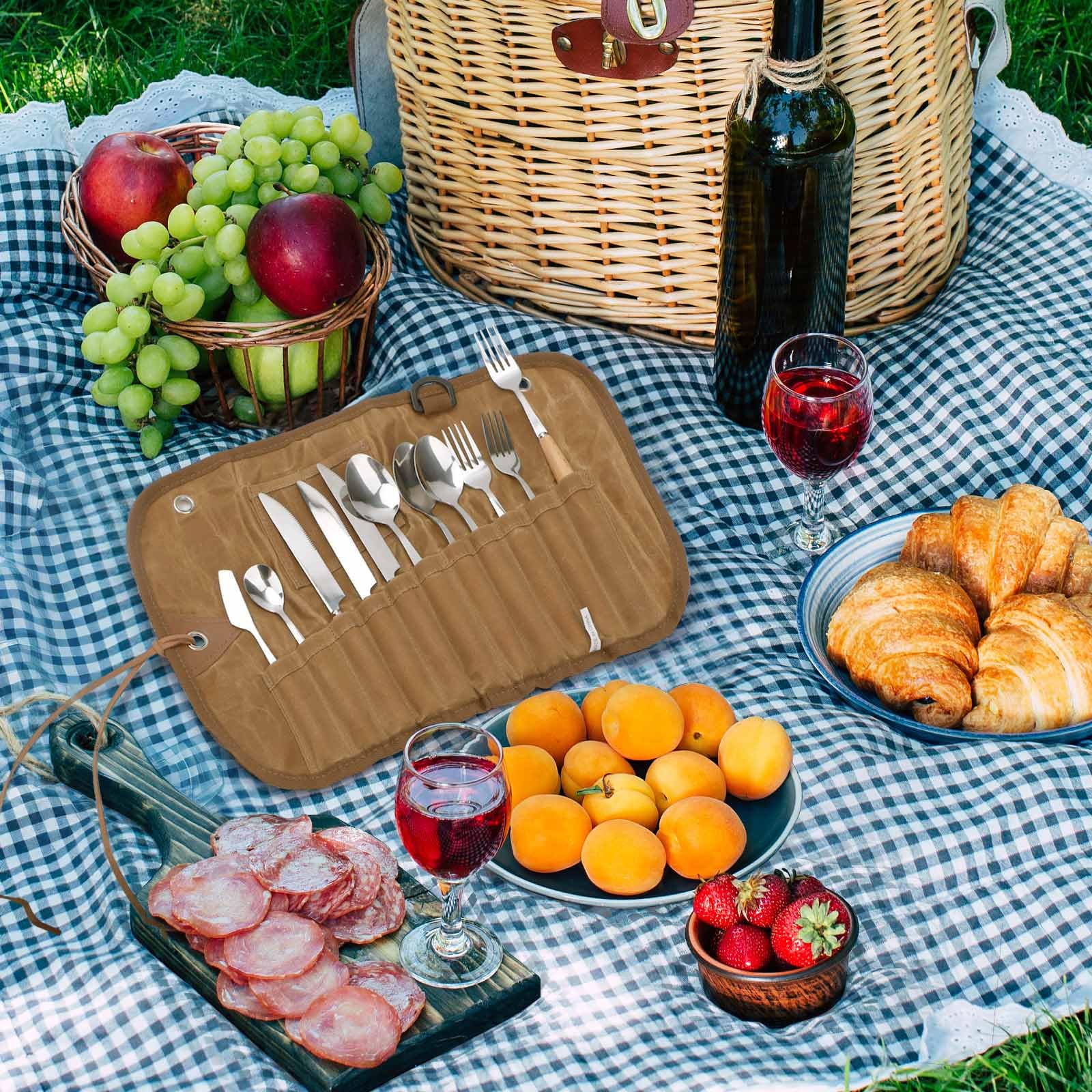 Ordnung im Camping-Chaos! Diese praktische Bestecktasche hält all deine Camping-Utensilien perfekt organisiert. Mit 31x13x12cm groß genug für Löffel, Gabeln, Messer, Essstäbchen und mehr. Aus 210D kariertem Stoff - wasserdicht und schmutzabweisend. Die interne Netztasche mit Reißverschluss hilft bei der Sortierung. Der weiche Griff (19cm) liegt gut in der Hand, auch bei langem Tragen. Leicht zu falten und platzsparend zu verstauen. Perfekt für Camping, Wandern, Grillabende oder Picknicks. Nie wieder suchen - alles hat seinen festen Platz. Mit nur 158g ein Leichtgewicht, das dein Outdoor-Leben viel einfacher macht!
