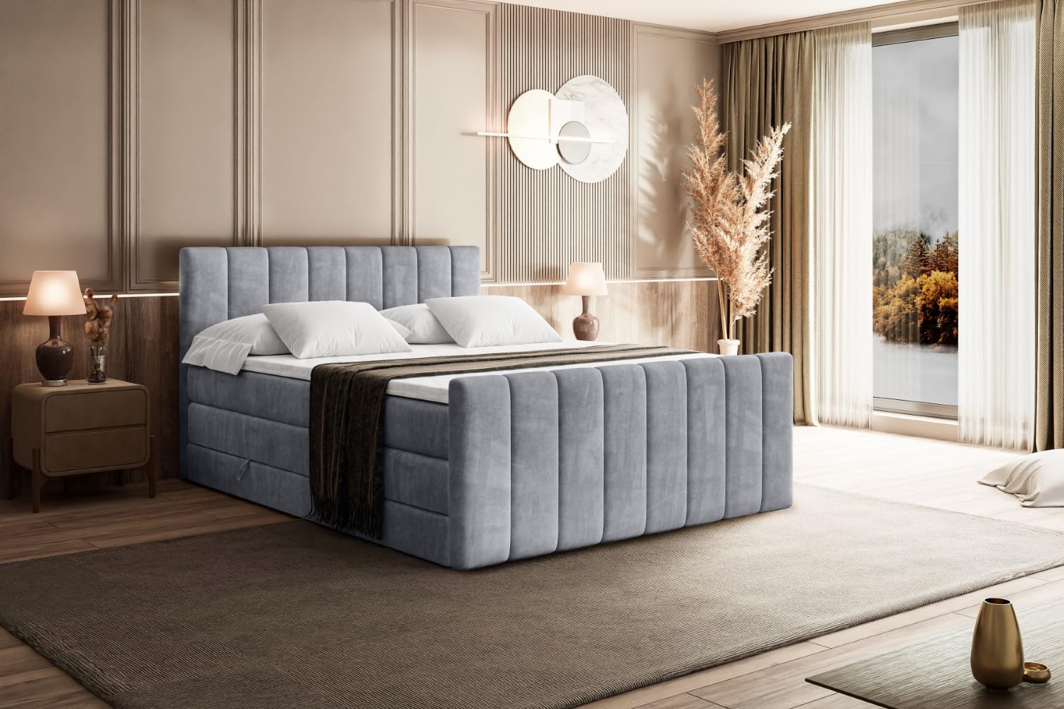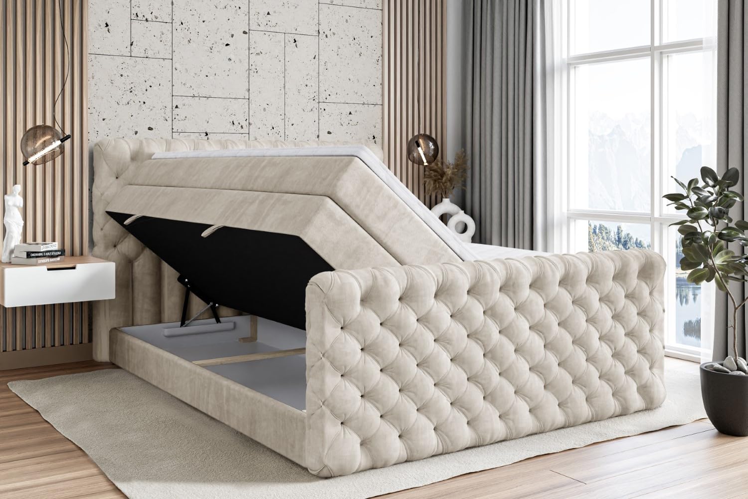 Träumst du von erholsamem Schlaf? Dieses Boxspringbett macht's möglich! Inklusive zwei Matratzen - eine mittelharte H3 mit Bonellfederung und eine etwas festere H4 mit Taschenfederung für optimalen Liegekomfort. Der 5 cm Topper sorgt für zusätzliche Weichheit und gute Luftzirkulation. Praktisch: Zwei große Bettkästen bieten jede Menge Stauraum für Bettwäsche oder Kissen. Der Casablanca-Stoff ist super pflegeleicht, wasserabweisend und super robust (45.000 Martindale-Zyklen). Lieferung inklusive Rahmen, beiden Matratzen und Topper - die Dekoration auf den Bildern ist natürlich nicht dabei. Maße: 131/151/171/191/211 x 217 x 115 cm | Material: Möbelplatte, Holz, Kunststoff | Füße: 2 cm hoch | Bezug waschbar bei 30°C | Für Allergiker geeignet | Wird bis zur Haustür geliefert - perfekt für ein gemütliches Schlafzimmer!