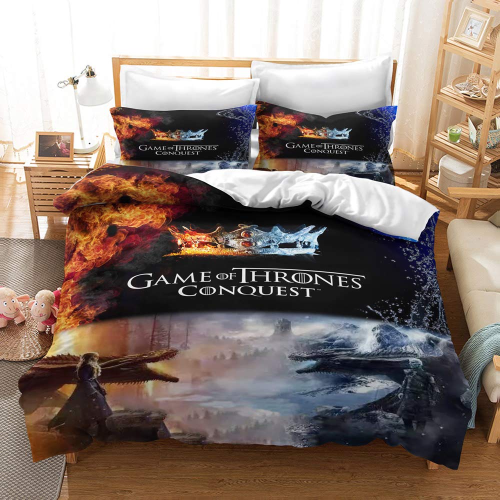 Wow, was für ein cooles Bettwäsche-Set für kleine Game of Thrones-Fans! 🐉 Dieses komplette Set besteht aus einem Bettbezug 135x200 cm und zwei Kissenbezügen 50x75 cm - perfekt fürs Kinderzimmer! Hergestellt aus 100% Baumwolle mit 118 Fäden fühlt sich die Bettwäsche super weich und angenehm auf der Haut an. Der versteckte Reißverschluss sieht nicht nur stylisch aus, sondern verhindert auch, dass sich dein Kind daran verhakt. Ganzjahres-tauglich und für jeden Raum geeignet - ob Schlafzimmer, Gästezimmer oder Kinderzimmer. Einfach bei 40°C waschen (beim ersten Mal separat) und schon strahlt das Design wieder! Die praktischen Rillen im Bezug machen das Einfädeln der Decke zum Kinderspiel. Dein Kind wird sich riesig freuen, jeden Abend in einem echten Game of Thrones-Bett zu schlafen! Perfekt für Teenager, die ihre Leidenschaft für die Serie ausleben wollen.