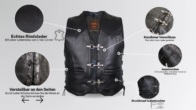 Echte Biker-Qualität! Diese robuste Lederweste aus Rindsleder (1,1-1,2mm dick) ist ein echter Hingucker. In Schwarz mit weichem Nappa-Leder für maximalen Tragekomfort. Mit 4 Außentaschen mit Reißverschluss und 2 Innentaschen (eine mit Druckknopf, eine mit Reißverschluss). Der nahtfreie Rücken ist ideal für Patches und Logos. Besonderheiten: eingenähte Schulter-/Rückenfalte und seitliche Schlitze für bessere Beweglichkeit, YKK-Reißverschluss. Wichtig: Fällt klein aus - besser eine Nummer größer bestellen! Perfekt für Motorradfahrer, Rocker oder alle, die echten Lederstyle lieben.
