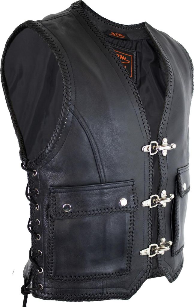 Echte Biker-Qualität! Diese coole Lederweste besteht aus echtem Büffel-Nubuk-Leder (1,1-1,2mm dick) mit perforiertem Unterteil für bessere Belüftung. Der Oberteil ist aus Rindsleder mit klassischer Karo-Steppung. Praktisch: Seitliche Reißverschlüsse für 5cm Erweiterung, kürzerer Rücken für besseren Sitz auf der Maschine, 2 Außen- und 2 Innentaschen mit Druckknopf. Die schwarze Farbe ist zeitlos, die Verarbeitung top. Ob auf der Straße oder in der Stadt - mit dieser Weste machst du immer eine gute Figur! Perfekt für Motorradfahrer, die Wert auf Style und Komfort legen.