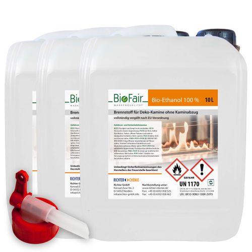 Echte Gemütlichkeit ohne lästigen Rauch oder Geruch! Unser hochwertiges Bioethanol verbrennt nahezu rückstandsfrei und sorgt für eine wunderschöne, gelbe Flamme in deinem Ethanolkamin. Hergestellt in Deutschland aus nachwachsenden Rohstoffen ist dieser Brennstoff nicht nur umweltfreundlich, sondern auch extrem praktisch: Kein Schornstein nötig, keine Asche und kein Ruß! Perfekt für alle Ethanol-Kamine, Tischkamine, Feuerschalen und Terrassenfeuer - sowohl innen als auch außen. Die 30 Liter sind aufgeteilt in 3 handliche 10-Liter-Kanister inklusive praktischem Ausgießer. Wichtiger Hinweis: Nicht für Gel-Kamine geeignet! Achtung: Flüssigkeit und Dampf sind leicht entzündbar. Bitte die Sicherheitshinweise deines Kamins beachten. Made in Germany mit kostenfreiem Versand! Für eine gemütliche Atmosphäre ohne Kompromisse.