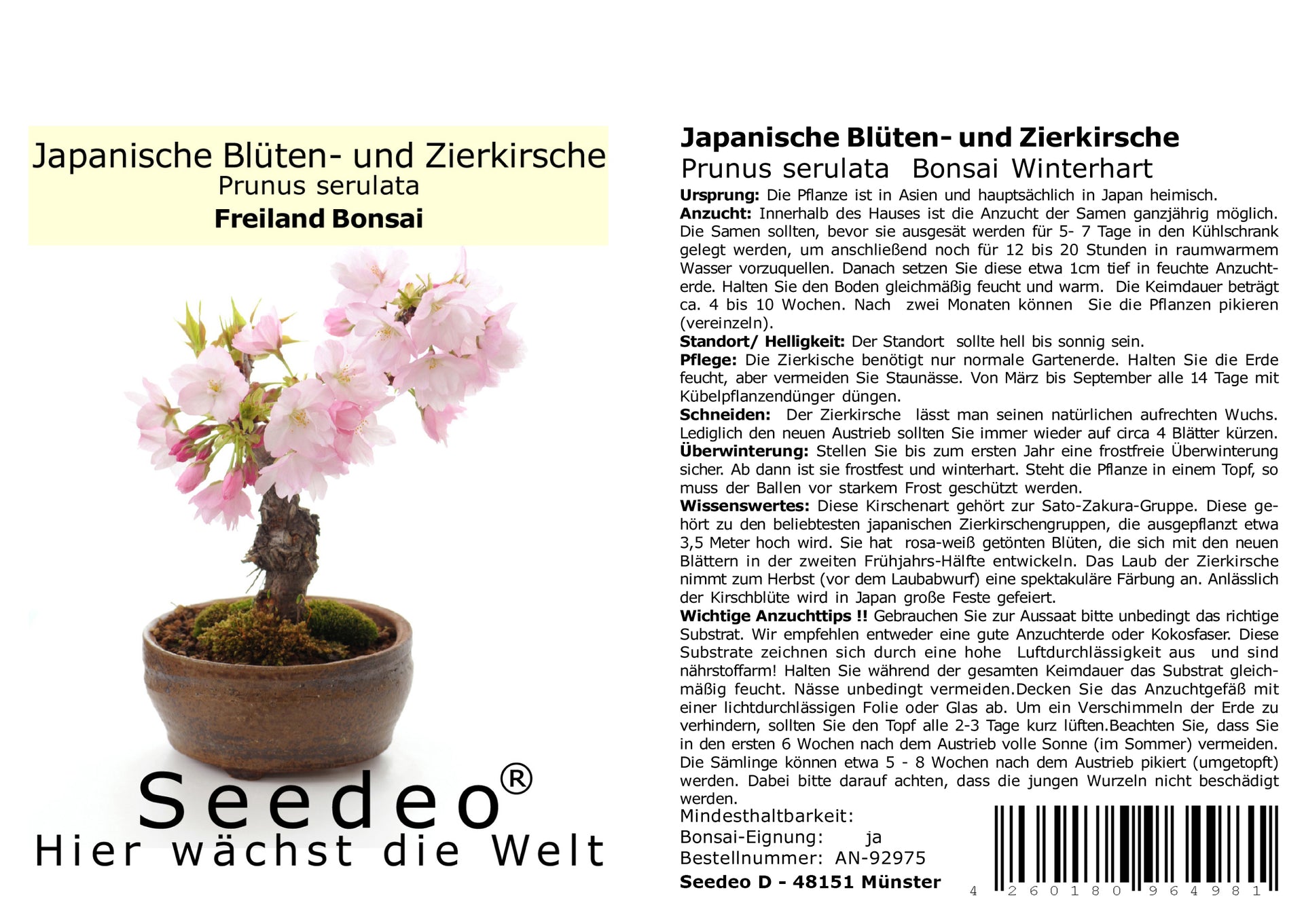 Züchte deinen eigenen Bonsai! Diese 30 Samen der Japanischen Blütenkirsche (Prunus serrulata) bringen asiatisches Flair in dein Zuhause. Die Japanische Zierkirsche ist bekannt für ihre üppige Blüte im April - ein echter Blickfang! Als Freiland-Bonsai geeignet, entwickelt sie mit der Zeit einen charakteristischen Stamm. Das Saatgut kommt aus Deutschland und ist von bester Qualität. Inklusive ausführlicher Anzucht-Anleitung für Erfolg von Anfang an. Perfekt für Gartenliebhaber und Bonsai-Fans. Ein faszinierendes Projekt für Geduldige - die Mühe lohnt sich! Erlebe die japanische Tradition der Kirschbaum-Kultivierung bei dir zu Hause. Die Blütenfeste in Japan zeigen, wie besonders diese Bäume sind!
