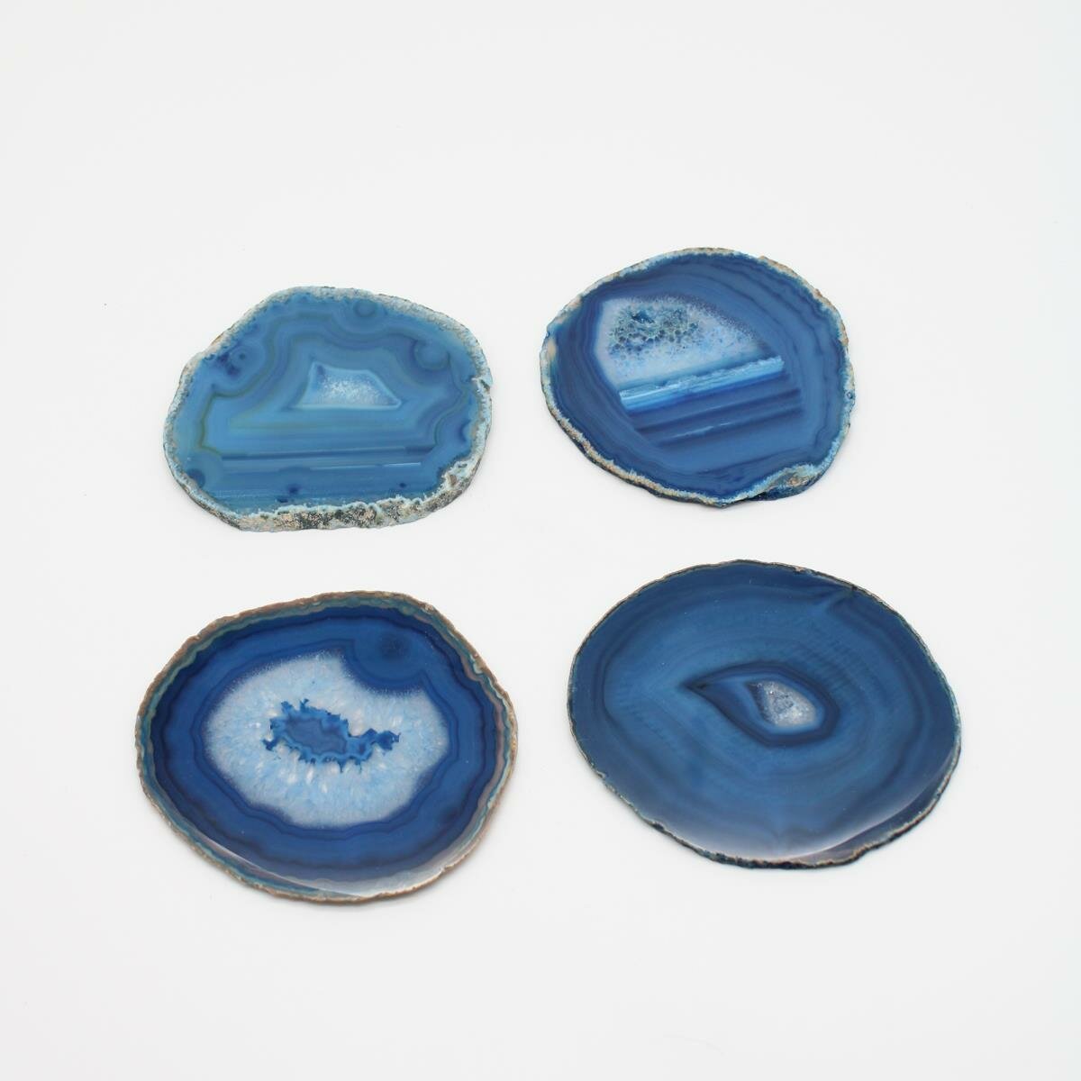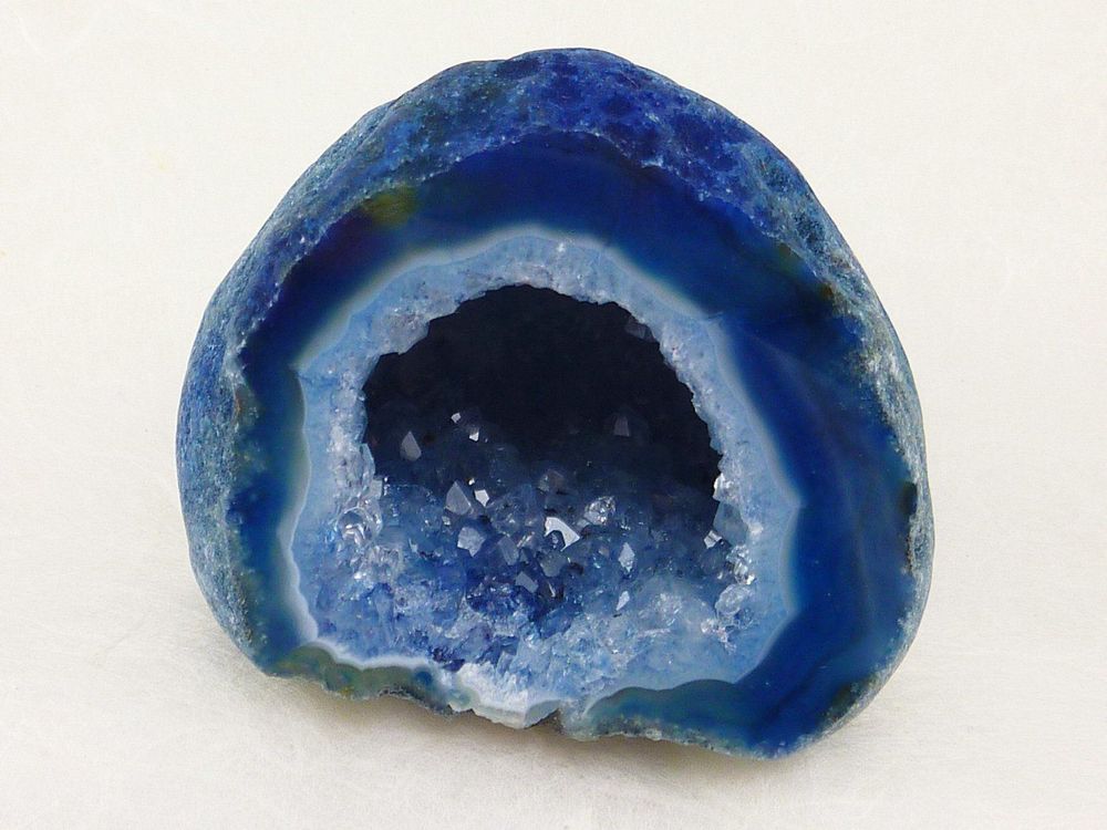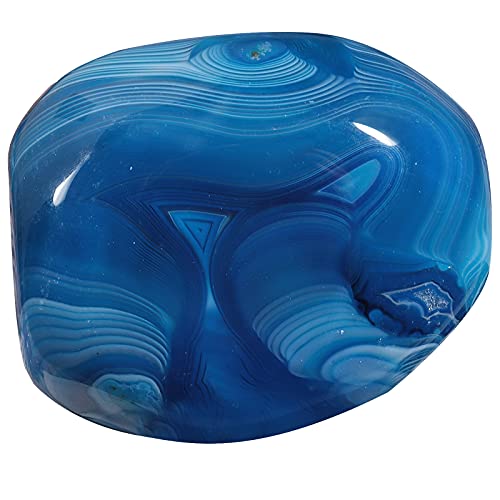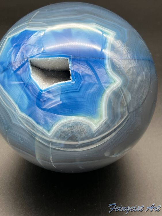 Wow, diese blaue Achat-Geode ist einfach atemberaubend schön! Eine halbe Geode aus Brasilien, aufgeschnitten und an der Schnittseite hochglanzpoliert - das glänzt richtig toll. Mit ca. 60-70mm Länge und 35-50mm Breite ist sie ein perfektes Deko-Element für dein Zuhause. Das Gewicht liegt bei etwa 180-220 Gramm - spürbar aber nicht zu schwer. Wichtig: Der Achat ist gefärbt, da die Naturfarbe grau/braun wäre. Bitte nicht mit Wasser in Berührung bringen, sonst kann er abfärben. Da es sich um eine natürliche Geode handelt, hat jede ihr eigenes einzigartiges Muster - dein Stück wird also unverwechselbar sein! Perfekt für Vitrinen, Regale oder als besonderes Accessoire auf dem Sideboard. Ein echter Hingucker der Gespräche anregt und deine Wohnung mit einem Hauch von Natur und Mystik bereichert. Einfach hinstellen und bewundern - die faszinierenden Strukturen im Inneren werden dich immer wieder begeistern!