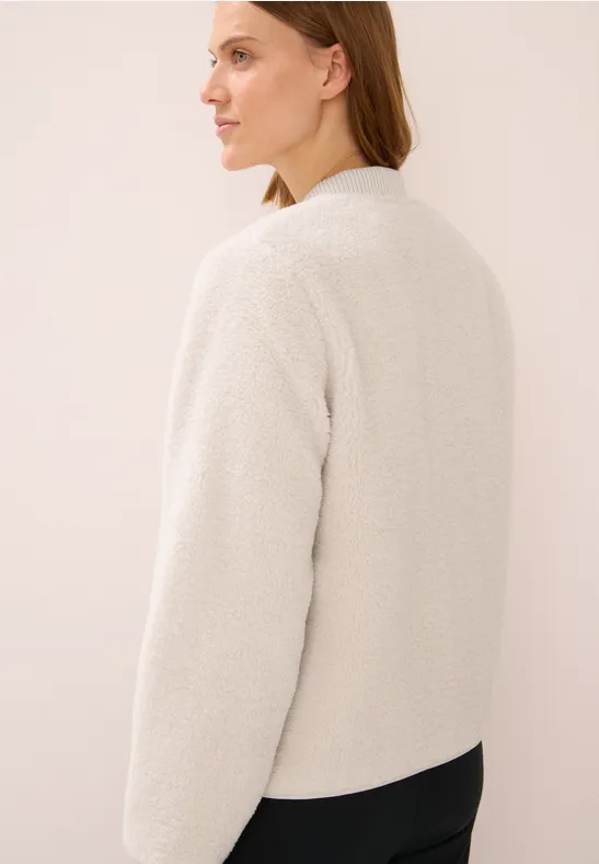 Zwei Jacken in einer - wie genial ist das denn? Dieser wendbare Blouson von CECIL gibt dir gleich zwei komplett verschiedene Looks! Auf der einen Seite stylishes Fake Fur mit coolem Print, auf der anderen Seite glatte Softshell-Oberfläche. So hast du für jede Stimmung und jeden Anlass die passende Jacke.\n\nDer Stehkragen sieht nicht nur gut aus, sondern schützt auch vor Wind. Die seitlichen Taschen sind super praktisch für deine Schlüssel, Handy oder einfach nur zum Händewärmen. Der Zipper schließt sicher und ist leicht zu bedienen.\n\nBei Größe M hat die Jacke eine Brustweite von etwa 61,5 cm und eine Länge von 64 cm - also ein schöner, normaler Schnitt, der den meisten Figuren flattert. Die Armlänge von 63,5 cm passt ebenfalls perfekt.\n\nDas Material ist weich und kuschelig - besonders die Fake-Fur-Seite fühlt sich super luxuriös an. Perfekt für den Herbst und Frühling, aber auch an milderen Wintertagen. Ob zum Einkaufen, für einen Stadtbummel oder fürs Wochenende - mit dieser Jacke bist du immer perfekt angezogen.\n\nEinfach wenden und du hast einen komplett neuen Look! So sparst du Platz im Schrank und hast trotzdem Abwechslung. Ein richtig cleveres Mode-Stück von CECIL!