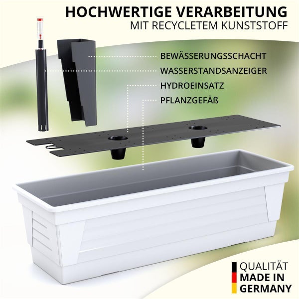 Aus stabilem Kunststoff, wetterfest und langlebig. Einfach bepflanzen, Wasser einfüllen und dich an deiner Blütenpracht erfreuen!