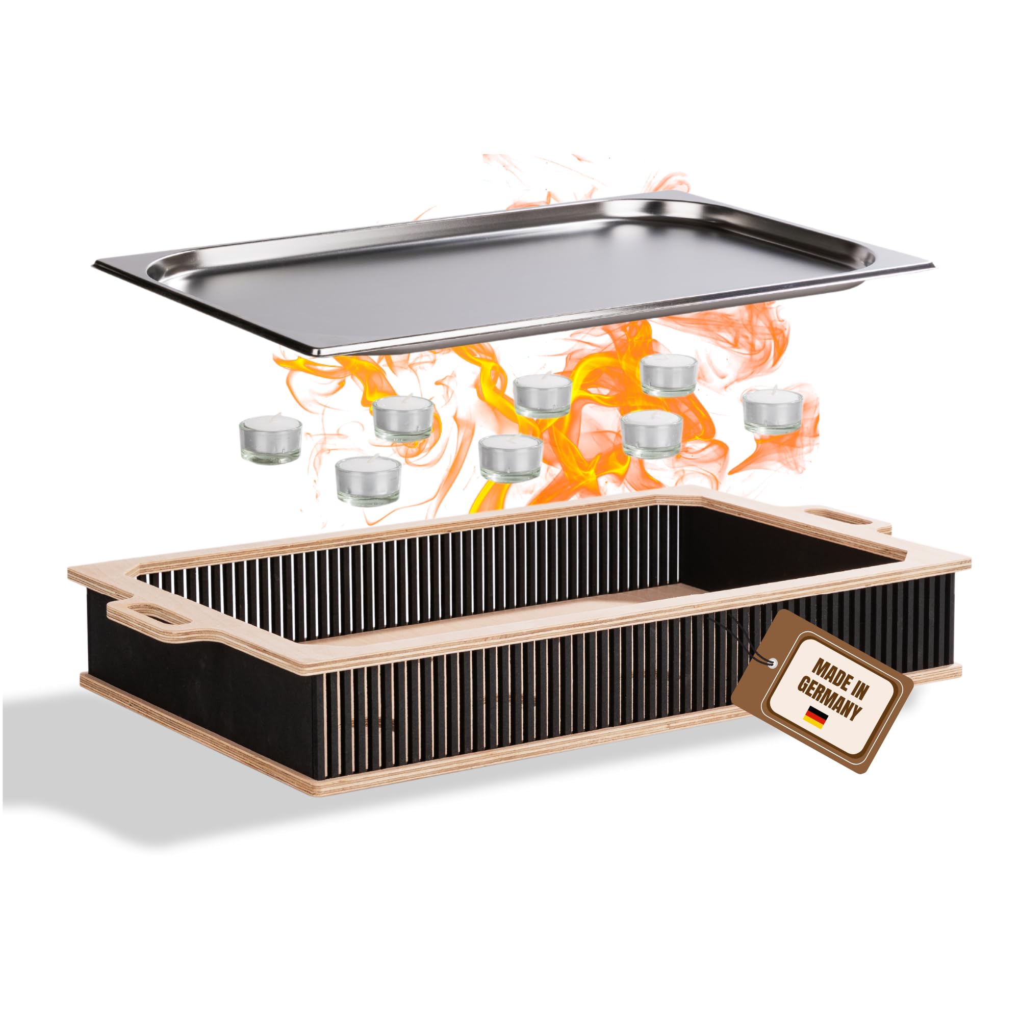 Grillmeister aufgepasst! Dieser Warmhalter ist der Game-Changer für jede Grillparty. Stell dir vor: Dein frisch gegrilltes Fleisch, Würstchen und Gemüse bleiben dank der Kerzenwärme stundenlang heiß und lecker. Kein Strom nötig - einfach die Teelichter unter den Edelstahlschalen anzünden und schon hast du eine professionelle Warmhalte-Station. Perfekt für Gartenpartys, Camping oder gemütliche Abende auf der Terrasse. Das schwarze Design sieht stylisch aus und besteht aus robustem Material. Im Lieferumfang sind Grillkasten, 2 Holzseitenwände, 2 Edelstahlschalen und Montagezubehör enthalten. Auch ein super Geschenk für Grill-Fans zu Vatertag, Geburtstag oder einfach so. Damit wird deine Grillparty zum absoluten Highlight - keine kalten Speisen mehr, nur noch entspanntes Genießen!