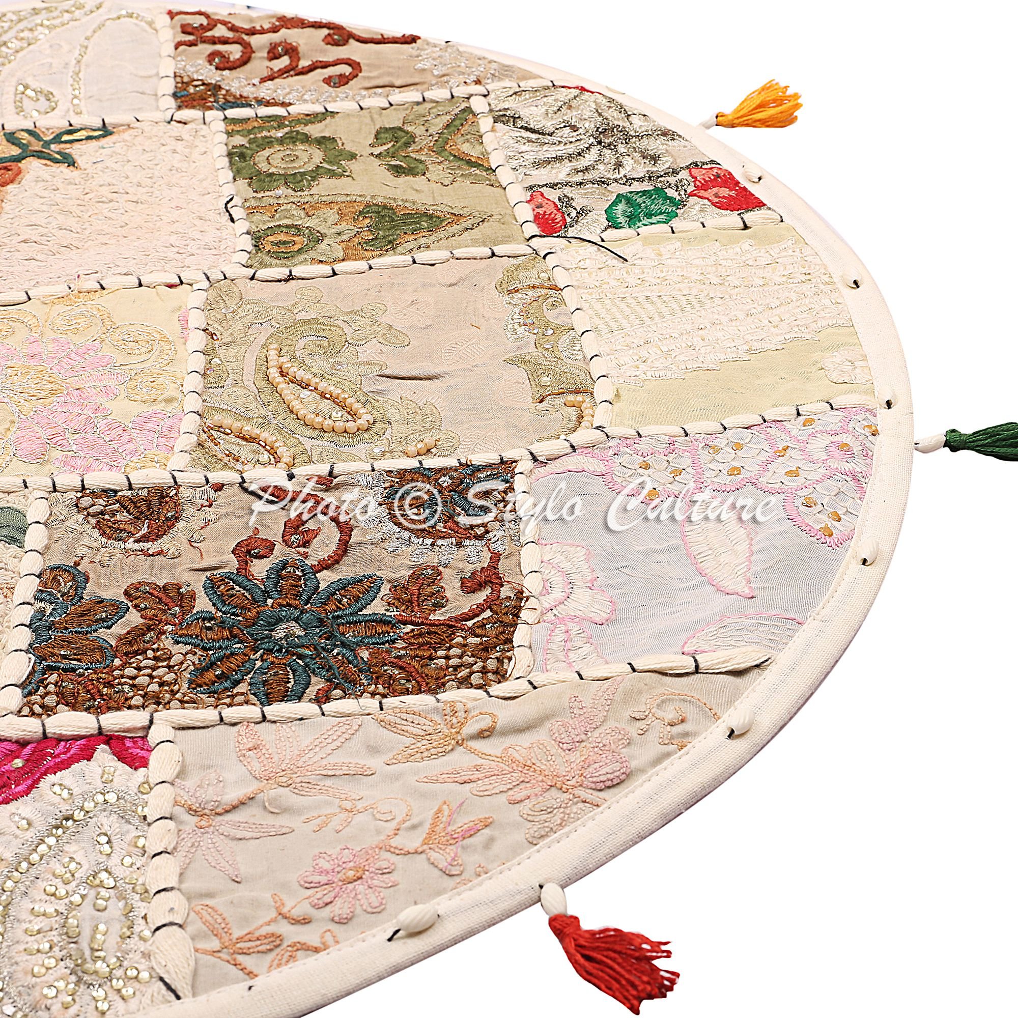 Total individueller Bodenkissenbezug aus Indien - jedes Stück ein Unikat! Mit 55cm Durchmesser perfekt zum Sitzen, Lounge oder als Deko. Das Besondere: Jeder Bezug wird in Handarbeit aus verschiedenen Stoffpatches zusammengenäht - keine zwei sind gleich! Die aufwändigen Stickereien und Quastenarbeiten machen das Ganze besonders. Unten ist ein Reißverschluss, damit du ihn ganz easy mit Baumwolle, alten Klamotten oder was auch immer du magst füllen kannst. Wichtig: Nur der Bezug ist enthalten, Füllung musst du separat besorgen. Passt super in's Wohnzimmer, Kinderzimmer oder als Meditationskissen - überall wo's gemütlich werden soll!