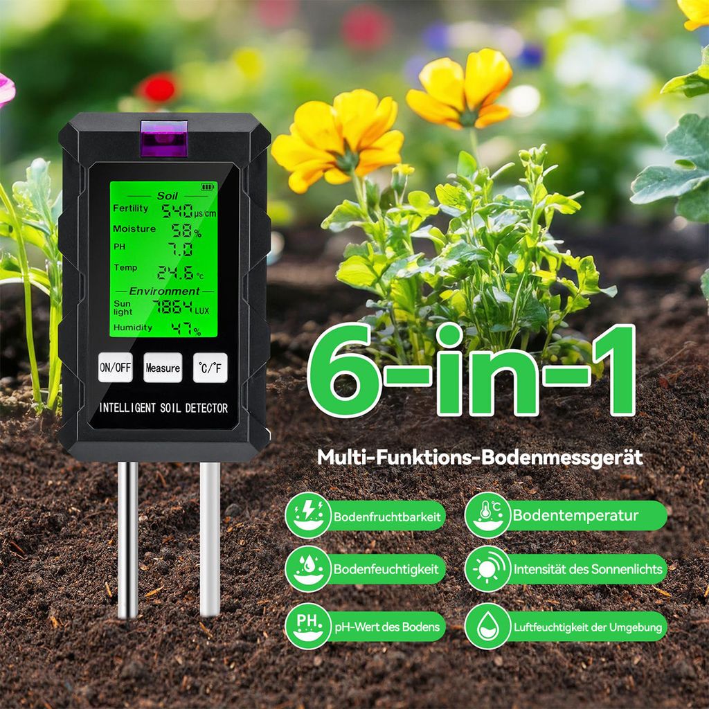 Wow, das ist mal ein cleveres Teil für alle Hobbygärtner und Profis! Dieser 7-in-1 Bodentester checkt alles auf einmal: pH-Wert, NPK-Nährstoffe, Feuchtigkeit, Temperatur und mehr. Einfach per USB mit deinem Android-Gerät verbinden und sofort siehst du alle Werte in der App. Super praktisch - keine Batterien nötig, einfach in die Erde stecken und los geht's! Mit 1,5m Kabel kommst du auch an schwer erreichbare Stellen. Wasserdicht nach IP68 und mit rostfreier Metallsonde, also perfekt für den Dauereinsatz im Garten. Ob für Blumenbeete, Gemüsegarten oder Rasen - mit diesem Tool weißt du immer genau, was deine Pflanzen brauchen. So macht Gärtnern richtig Spaß!