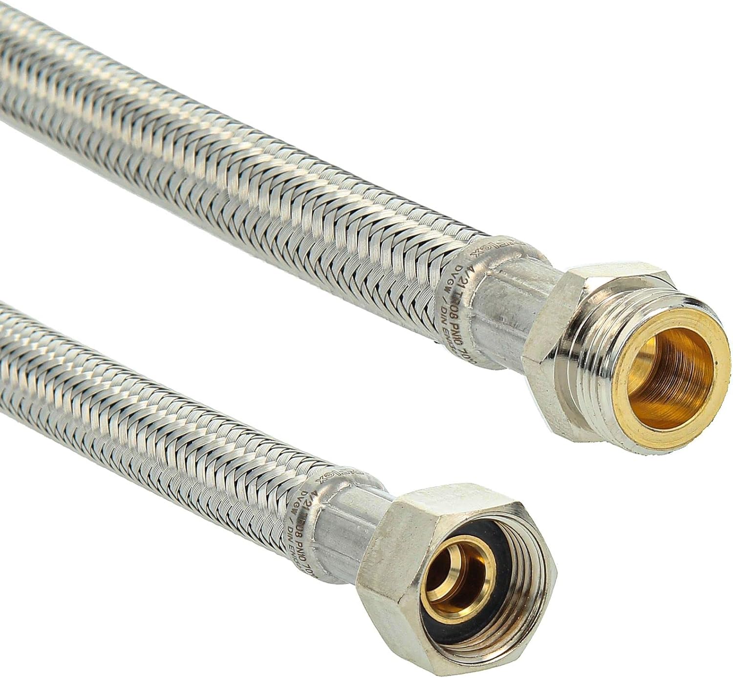 Materialien und Qualität:• Innenschlauch: HDPE• Umflechtung: Edelstahl 1.4301• Anschlüsse: Vernickeltes Messing• Zulassung: KTW-A, DVGW W270