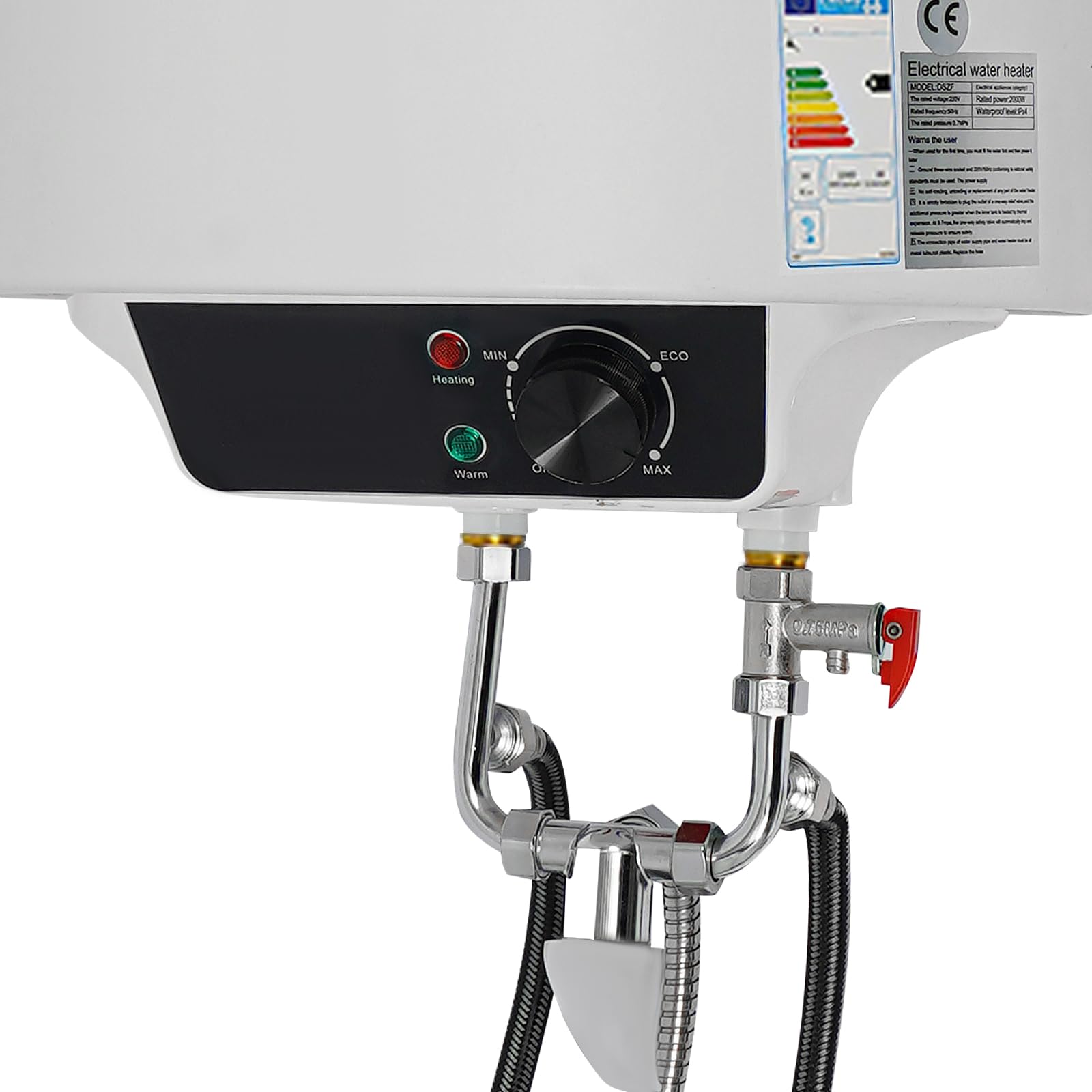 Nie wieder kalt duschen! Dieser praktische 50L Elektro-Boiler sorgt für zuverlässiges Warmwasser in Küche, Bad oder Gewerbe. Mit 2000W Leistung und Edelstahl-Heizrohr für schnelle Aufheizzeit. Temperatur einstellbar von 25-75°C über benutzerfreundliches Display. Inklusive Handbrause, Wasserhahn und allen Montagezubehör. Sicherheitsfeatures: Leckage-Schutz, IPX4 Wasserschutz. Perfekt für Wohnung, Haus, Friseursalon oder Café. Einfache Wandmontage, EU-Stecker. Maße: 34x71cm. Alles dabei für sofortigen Warmwasser-Komfort - einfach installieren und duschen!