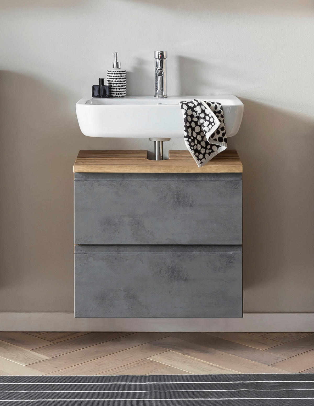 Mehr Ordnung im Badezimmer? Dieser Makastle Waschbeckenunterschrank ist die Lösung! Mit 60x34,5x60cm (BxTxH) hat er die perfekte Größe für die meisten Badezimmer. In schicker Braun-Eiche Optik aus robustem Holzwerkstoff mit Stahlrahmen - also richtig stabil! Drin verstecken sich eine praktische Schublade (53,5x28,5x21cm) und ein Staufach mit Gasdruckfeder. Die Tischplatte hält bis zu 20kg aus, die Schublade 5kg und insgesamt trägt der Schrank 60kg! Achtung: Das Waschbecken ist nicht dabei und zur Sicherheit sollte der Schrank mit der mitgelieferten Wandhalterung gesichert werden. Die glatte Oberfläche ist super leicht zu reinigen - einfach mit nem feuchten Tuch abwischen. Zusammenbau ist nötig, aber danach hast du jahrelang Freude an diesem stylischen und praktischen Badezimmermöbel!