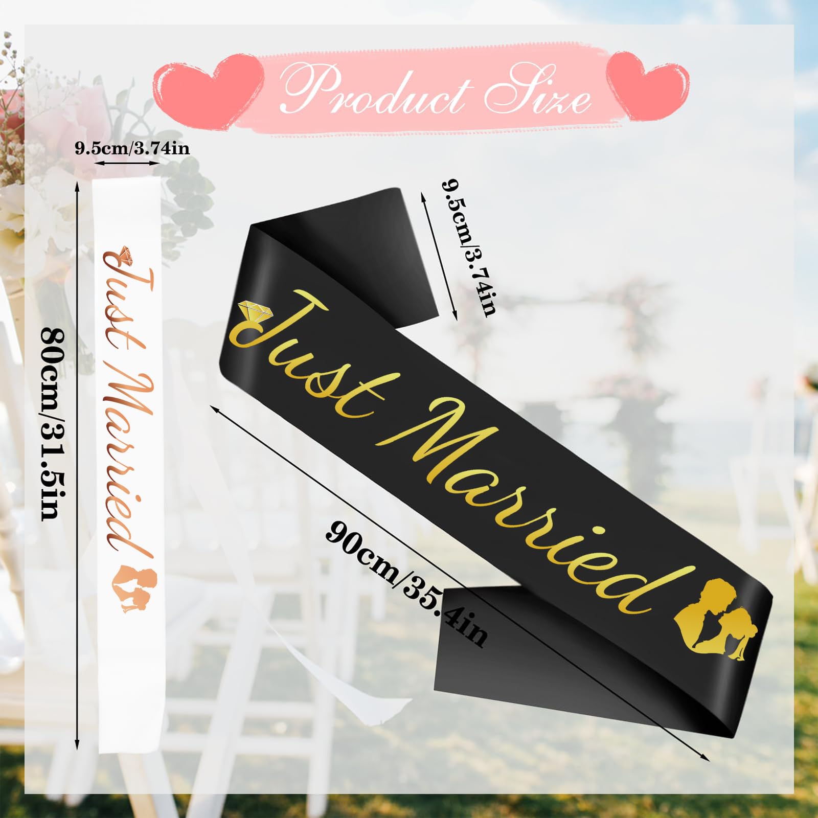 Hey, ihr plant ne Junggesellinnenparty oder Hochzeit? Dann sind diese 'Just Married' Sashs genau das Richtige! Im Set enthalten: eine weiße Sash mit rosa-goldenen Buchstaben für die Braut und eine schwarze mit goldenem Schriftzug für den Bräutigam. Die Schärpen sind aus hochwertigem Glitzerstoff, knittern nicht und die Buchstaben blättern nicht ab - versprochen! Mit 80 cm Länge und ner Sicherheitsnadel dabei passen sie fast jedem. Super als Foto-Accessoire und um den besonderen Tag festzuhalten. Tipp: Falls die Sash angeknittert ankommt, einfach von der Rückseite bügeln (nicht auf die Folie!). Viel Spaß bei der Feier!