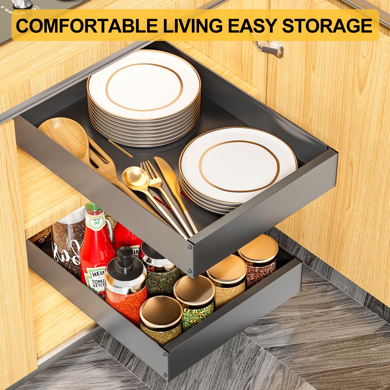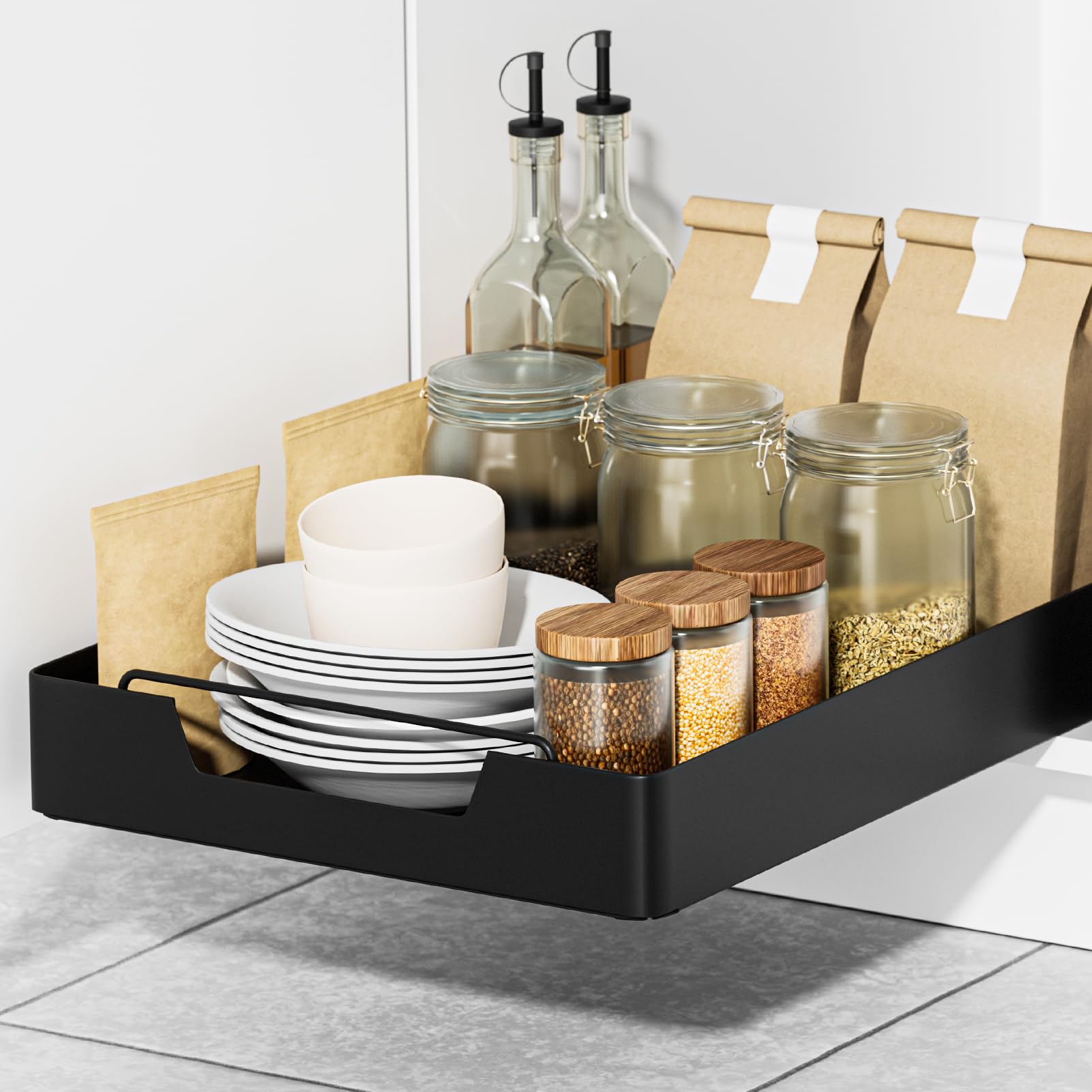 Hergestellt aus robustem Kohlenstoffstahl mit Pulverbeschichtung, hält die Schublade bis zu 30 kg aus. Die Schienen gleiten super geschmeidig und leise. Einfach messen, kleben und schon hast du mehr Ordnung im Schrank!