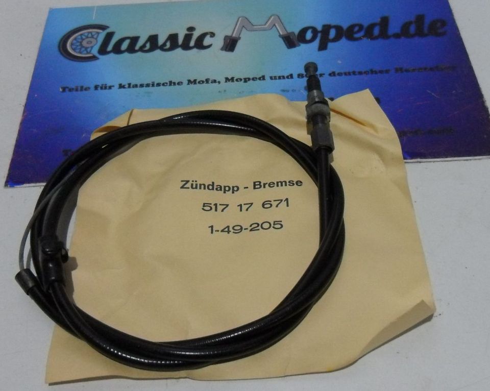 Bremsprobleme mit deiner Zündapp? Dieser originale Bremszug für die C 50 Super Typ 441-01L0 und 441-05L2 bringt Sicherheit zurück! Grau, für vorne, mit 980mm Seillänge und 860mm Hüllenlänge. Aus Stahlseil und PVC-Hülle, mit Birnennippeln Ø6x10mm. Inklusive Bowdenzugspanner M6. Einfacher Einbau - wichtig: Länge und Aufnahmen vorher vergleichen! OE-Nummer 433-17.628. Für sichere Bremsleistung und sorgenfreies Fahren. Qualitativ hochwertig wie das Original. Mach deine Zündapp wieder verkehrssicher - bestelle jetzt und fahre morgen wieder sicher!