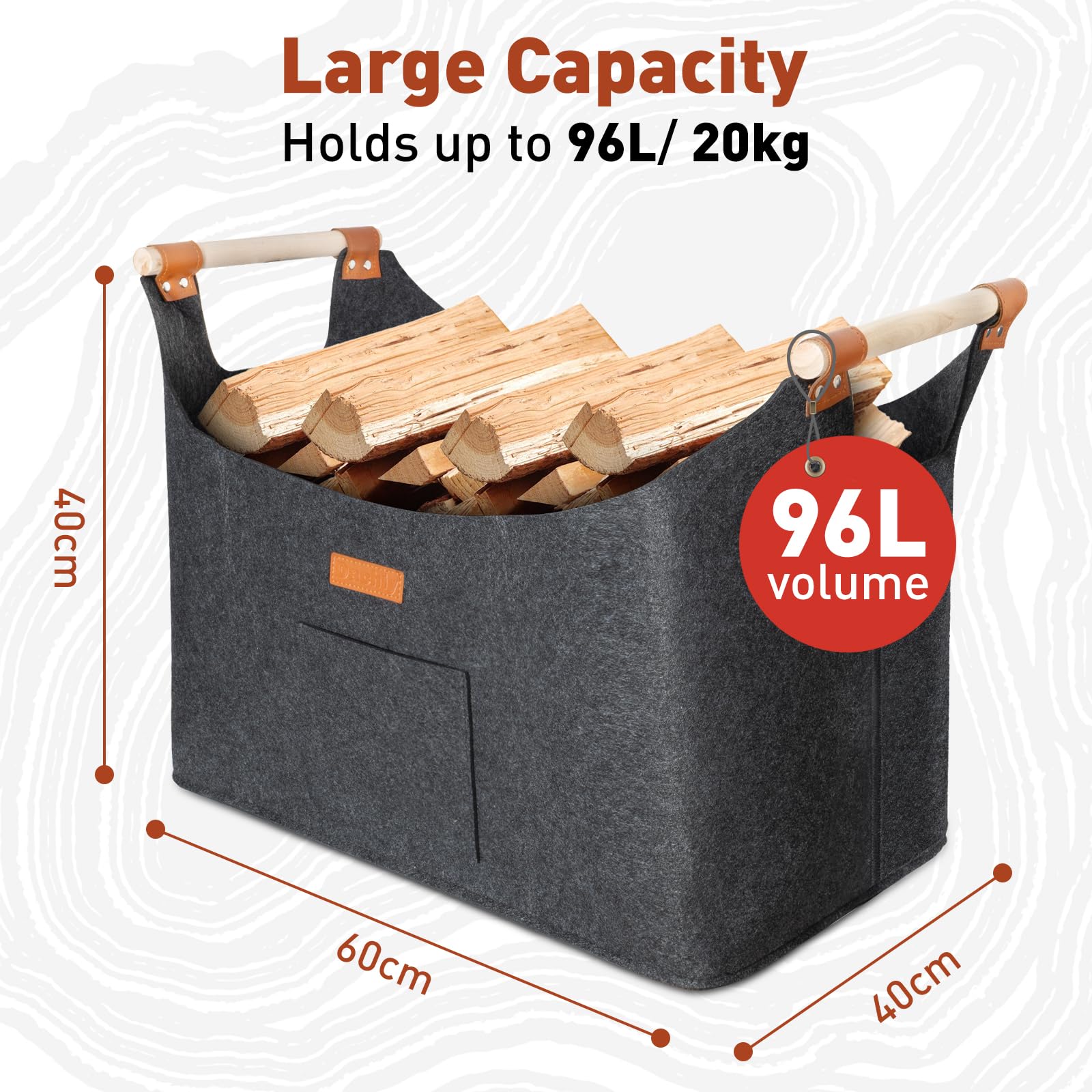 Holz tragen war noch nie so stylisch! Diese XXL Brennholztasche aus extra dickem Filz macht dich zum Kamin-Profi. Mit 60x40x40cm und 96 Litern Fassungsvermögen - Platz für ne Menge Brennholz!