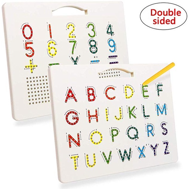 Dein Kleines entdeckt gerade die Welt der Buchstaben? Dieses magnetische Lernbrett ist perfekt dafür! Doppelseitig mit Groß- und Kleinbuchstaben, dazu noch Zahlen. Mit Stift zum Nachfahren - die Strichreihenfolge ist vorgegeben, so lernen die Kids gleich die richtige Schreibweise. Aus robustem ABS-Material, also hält auch mal was aus. Der Stift ist an der Tafel befestigt, geht nicht so schnell verloren. Super für unterwegs - leicht und kompakt. Macht Lernzeit zur Spielzeit! Ideal für Vorschulkinder ab 3 Jahren. Auch ein tolles Geschenk zu Geburtstag oder Weihnachten. So macht Buchstaben lernen richtig Spaß und die Kleinen sind beschäftigt, während sie was Sinnvolles lernen!