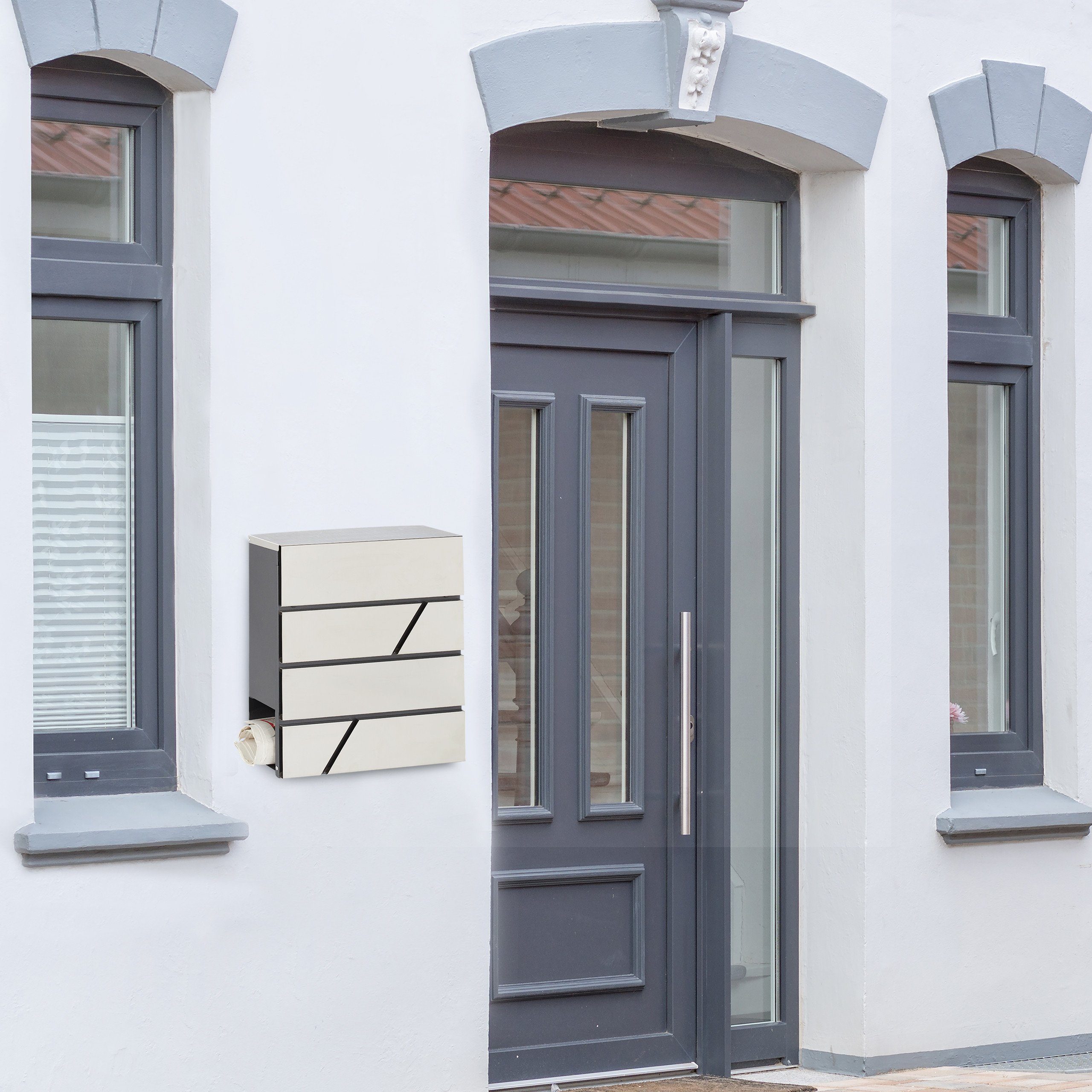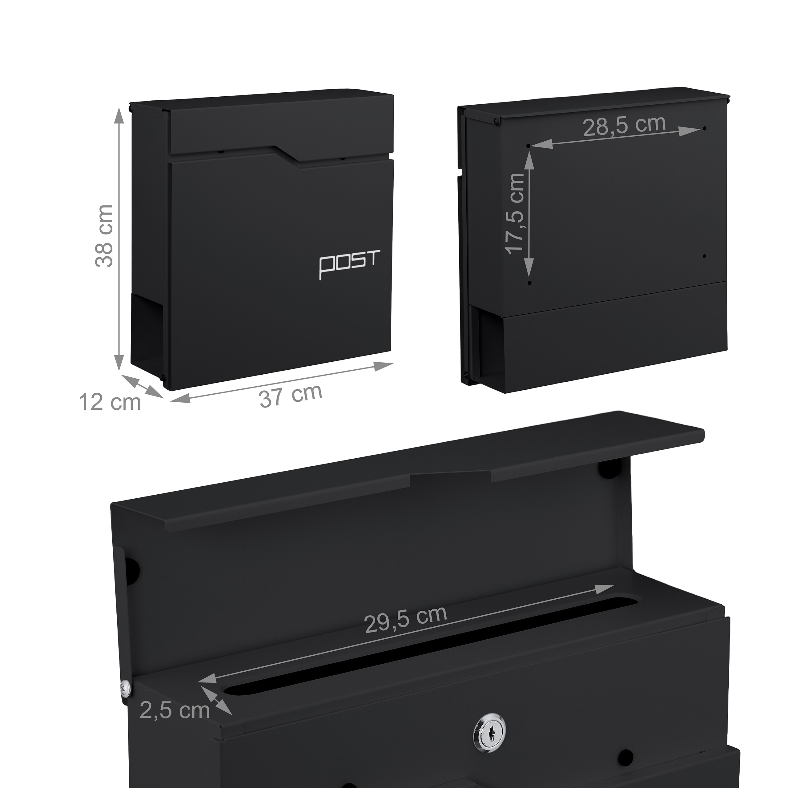 Suchst du einen stylischen Briefkasten der auch Zeitungen aufnehmen kann? Der Relaxdays Briefkasten in mattem Schwarz ist genau das Richtige! 📬\n\nMaße: 38 x 37 x 12 cm (HxBxT) - groß genug für Umschläge bis DIN C4 Format und natürlich Zeitungen.\n\nFeatures die überzeugen:\n• Abschließbar mit verstecktem Zylinderschloss\n• 4 Schlüssel inklusive (Haupt- + Ersatzschlüssel)\n• Breiter Briefschlitz mit Regenschutzklappe\n• Dekorative Post-Aufschrift\n• Aus pulverbeschichtetem Stahl\n\nDer moderne Look mit dekorativem Muster passt super zu contemporary Häuserfassaden. Mattes Schwarz wirkt edel und unaufdringlich.\n\nMontage ist einfach: 4 Bohrungen zur sicheren Wandbefestigung am Haus, Garagenwand oder Pfosten. Robust verarbeitet für viele Jahre zuverlässigen Service.\n\nPerfekt für alle die:\n• Wert auf sicheres Postfach legen\n• Zeitungen und Magazine erhalten\n• Modernes Design mögen\n• Langlebige Qualität schätzen\n\nKein langes Suchen mehr nach dem Zeitungsfach - jetzt ist alles in einem praktischen Briefkasten vereint. Deine Post ist sicher und geschützt vor Witterung!