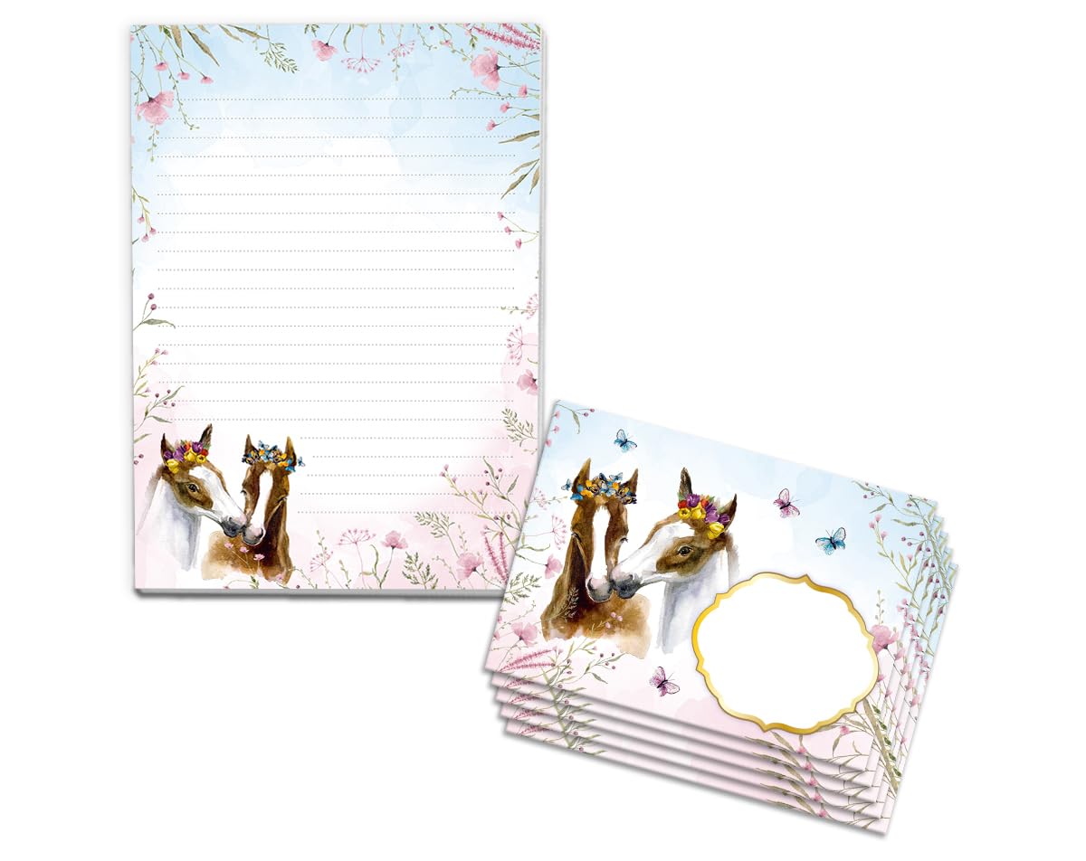 Für alle kleinen Pferdefans! Dieses süße Briefpapier-Set bringt jede Menge Schreibspaß. Im Set enthalten ist ein A5 Briefblock mit 25 linierten Blättern und 15 passenden Umschlägen im C6 Format. Die Blätter haben eine angenehme Stärke von 80g und sind oben geleimt - praktisch zum Abtrennen. Die Rückseiten sind unbedruckt, sodass auch die längsten Briefe Platz finden. Besonders praktisch: Die Umschläge sind bereits mit Haftkleber versehen, kein lästiges Lecken mehr! Hergestellt in Deutschland, garantieren wir höchste Qualität und kindgerechte Materialien. Wenn deine Tochter also Brieffreundinnen hat oder einfach gerne schreibt, ist dieses Set das perfekte Geschenk. Und falls ihr mehr Motive mögt - wir haben auch Einhörner, Katzen und viele andere Designs im Angebot!