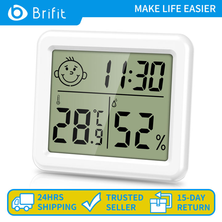 Hey, kennst du das? Du fragst dich, warum es sich in manchen Räumen einfach ungemütlich anfühlt? Mit dem Brifit Digital Thermometer hast du immer den Überblick über Temperatur und Luftfeuchtigkeit! Das kleine Teil ist richtig praktisch.\n\nDas Display ist mega klar und die Zahlen sind schön groß - du siehst also auf einen Blick, was los ist. Temperatur und Feuchtigkeit werden alle 10 Sekunden aktualisiert, also immer aktuell. Und die Genauigkeit ist hammer: ±1°C bei Temperatur und ±5% bei Luftfeuchtigkeit.\n\nAber das Beste: Dieses Thermometer hat so süße Smiley-Gesichter! Zeigt dir an, ob die Luft zu trocken, perfekt oder zu feucht ist. So weißt du sofort, wann du lüften oder vielleicht die Heizung anmachen solltest.\n\nUnd es kann noch mehr: Datum und Uhrzeit werden auch angezeigt - kannst zwischen 12 und 24 Stunden Format wechseln. Temperatur in °C oder °F - alles kein Problem. Das Gerät ist nur 3,15 x 2,75 Zoll klein, passt also überall hin.\n\nDu kannst es aufstellen oder an die Wand hängen - gibt sogar Aufhängelecher und doppelseitiges Klebeband mit. Perfekt fürs Wohnzimmer, Schlafzimmer, Babyzimmer, Gewächshaus oder sogar den Weinkeller! Überall dort, wo das Klima stimmen muss.\n\nWeißt du, warum das so wichtig ist? Die richtige Luftfeuchtigkeit (zwischen 40-60%) ist mega wichtig für dein Wohlbefinden und beugt sogar Schimmel vor. Mit diesem kleinen Helfer behältst du alles im Blick - deine Familie wird's dir danken!