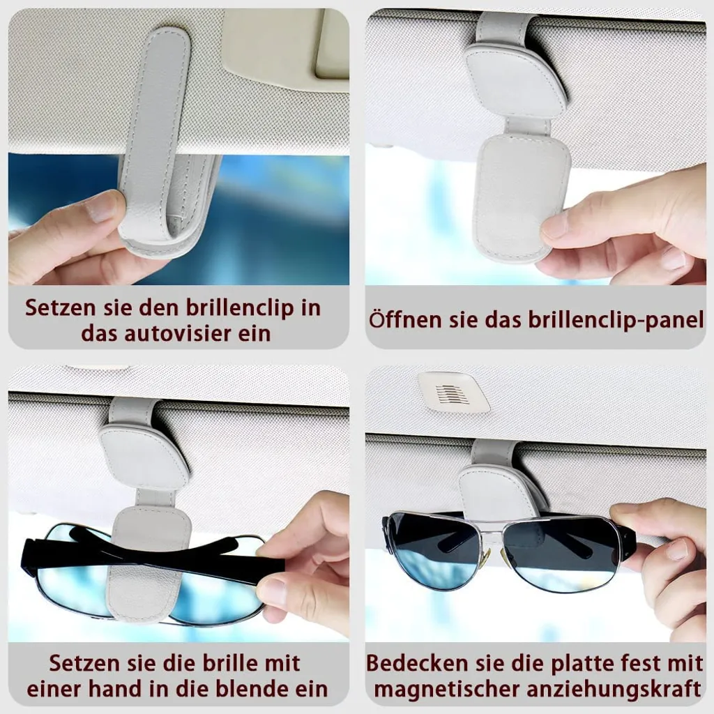 Kennst du das? Deine Sonnenbrille fliegt durchs Auto oder du kramst ewig danach? Mit diesen magnetischen Brillenhaltern gehört das der Vergangenheit an! Einfach an der Sonnenblende befestigen und die Brille mit dem starken Magnet sicher verstauen. Das elegante Leder-Design sieht nicht nur gut aus, sondern blockiert auch nicht deine Sicht. Perfekt für alle, die häufig zwischen Sonnenbrille und normaler Brille wechseln - besonders praktisch bei Gegenlicht oder in Tunneln. Im 4er-Set genug für alle Insassen oder als Reserve. Mach dein Auto aufgeräumter und deine Fahrten sicherer - ohne lästiges Suchen und Herumfliegende Brillen!