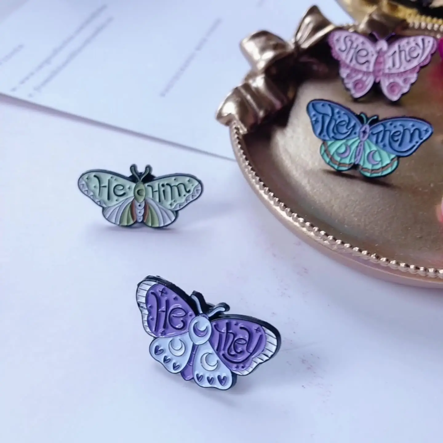 Wie niedlich sind denn diese Schmetterlings-Pronomen-Broschen! 5 verschiedene Stile im Set - She/They, He/Him, They/Them, She/Her, He/They! Aus hochwertiger Emaille - farbenfroh und langlebig! Maße: ca. 1,52x2,79cm - diskret aber auffällig genug! Perfekt um deine Pronomen zu zeigen oder als Statement-Accessoire! Einfach an Taschen, Rucksäcken, Jacken oder Hüten befestigen! Super Geschenk für Freunde, Familie oder Kollegen! Die süßen Schmetterlings-Motive machen jede Kleidung bunter! Robust verarbeitet - verblasst nicht und rostet nicht! Zeige wer du bist - mit Stil und Charme! Hol dir dieses tolle Set und mache die Welt ein bisschen bunter und inklusiver! Einfach anstecken und strahlen!