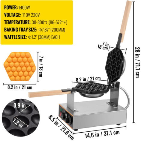 Waffel-Liebhaber, aufgepasst! Dieser professionelle Bubble Waffle Maker macht die leckeren Kugelwaffeln wie vom Imbissstand. Mit 1500W Leistung und 220V bist du schnell startbereit. Die 180° Drehfunktion sorgt für gleichmäßiges Backen auf beiden Seiten, und die einstellbare Temperatur (50-300°C) und Timer (1-5 Minuten) geben dir volle Kontrolle. Die Antihaftbeschichtung verhindert das Anbrennen und macht die Reinigung super easy. Maße: 37,5x33x22,5 cm, also perfekt für Theke oder Tresen. Ob im Café, Imbiss oder zu Hause - damit machst du jeden zum Waffel-Fan. Achtung: Beim ersten Mal kann's etwas rauchen (normales Einbrennen). Hol dir den Waffel-Spaß!
