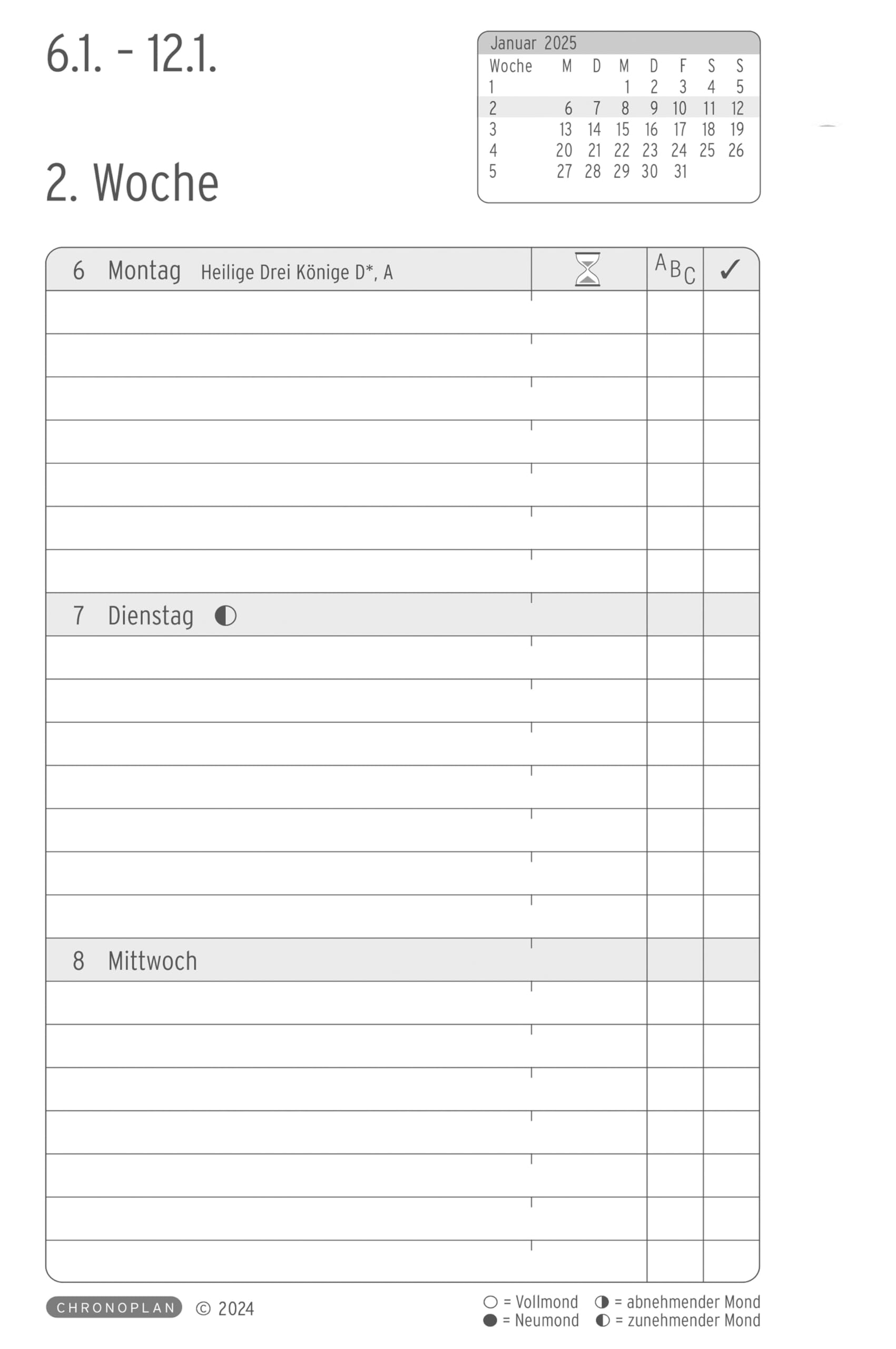 Ordnung muss sein! Der Chronoplan Wochenkalender für 2026 hilft dir, den Überblick zu behalten. Im handlichen A5-Format (135x210 mm) mit weichem, weißem Cover und Leinenprägung. Übersichtliche Wocheneinteilung: 1 Woche auf 2 Seiten, mit Platz für Termine bis 22 Uhr. Praktische Extras: Flexible Stiftschlaufe, Einmerkband, Magnetverschluss. Enthält Jahresplan, Ferienübersicht und Notizseiten. Das FSC-zertifizierte Papier ist angenehm cremefarben und beschreibfreundlich. Perfekt für Beruf, Studium oder Privatleben. Hilft bei der Priorisierung von Aufgaben und der Wochenplanung. Hochwertige Verarbeitung - hält das ganze Jahr durch. Macht Planung einfach und organisiert. Für alle, die ihre Zeit im Griff behalten wollen. Ein treuer Begleiter durch das ganze Jahr 2026!