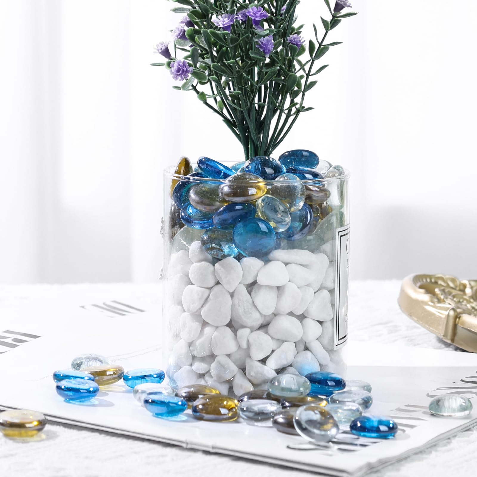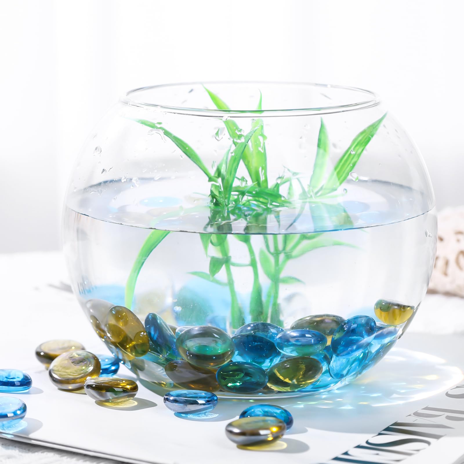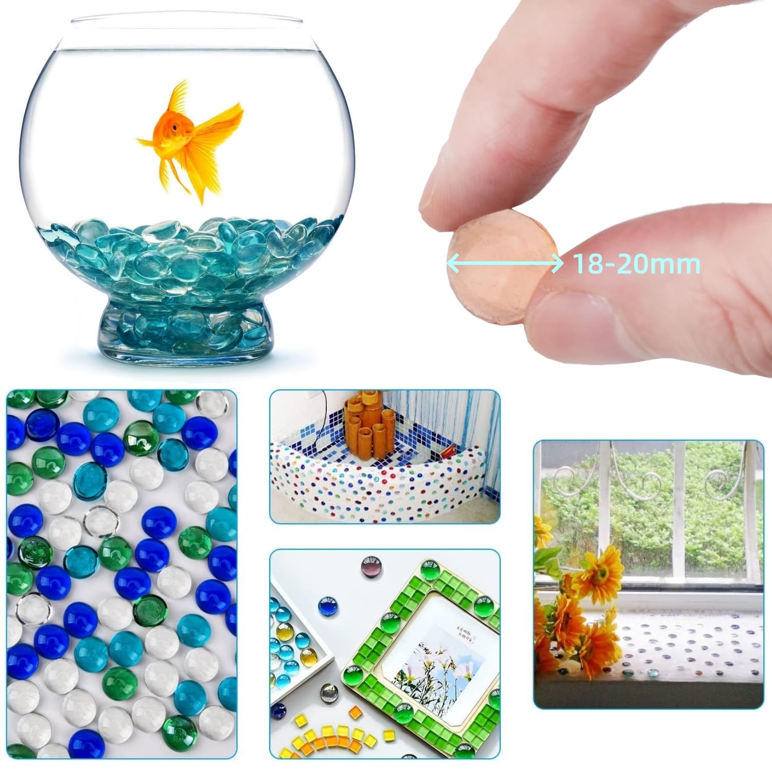 Wow, was für eine Farbenpracht! Diese 400 bunten Glasnuggets sind ja mal der absolute Hingucker für jede Deko. Ob in der Vase, auf'm Tisch oder beim Basteln - die Steinchen bringen sofort Leben in die Bude!\\n\\nDas Paket enthält satte 2000g Glassteine in allen möglichen knalligen Farben. Es gibt runde und ovale Formen, alle zwischen 15 und 20mm groß. Die Oberfläche ist super glatt und kratzt nicht - perfekt auch für Kinderhände.\\n\\n• 400 Stück Glasnuggets\\n• Gesamtgewicht: 2000g\\n• Größe: 15-20mm\\n• Bunte Farbmischung\\n• Runde und ovale Formen\\n• Hochwertiges Glas\\n\\nEinfach in die Vase füllen und staunen, wie magisch die Steine im Wasser glitzern! Oder du bastelst damit:\\n• Kerzenständer verzieren\\n• Lampenschirme gestalten\\n• Tischdekorationen\\n• Garten-Deko\\n• Hochzeitsdekoration\\n\\nDie Muggelsteine sind übrigens mega robust und brechen nicht so leicht. Du kannst sie immer wieder verwenden - super praktisch! Egal ob für's Wohnzimmer, Schlafzimmer oder draußen im Garten: Mit diesen bunten Steinen wird alles gleich viel fröhlicher.