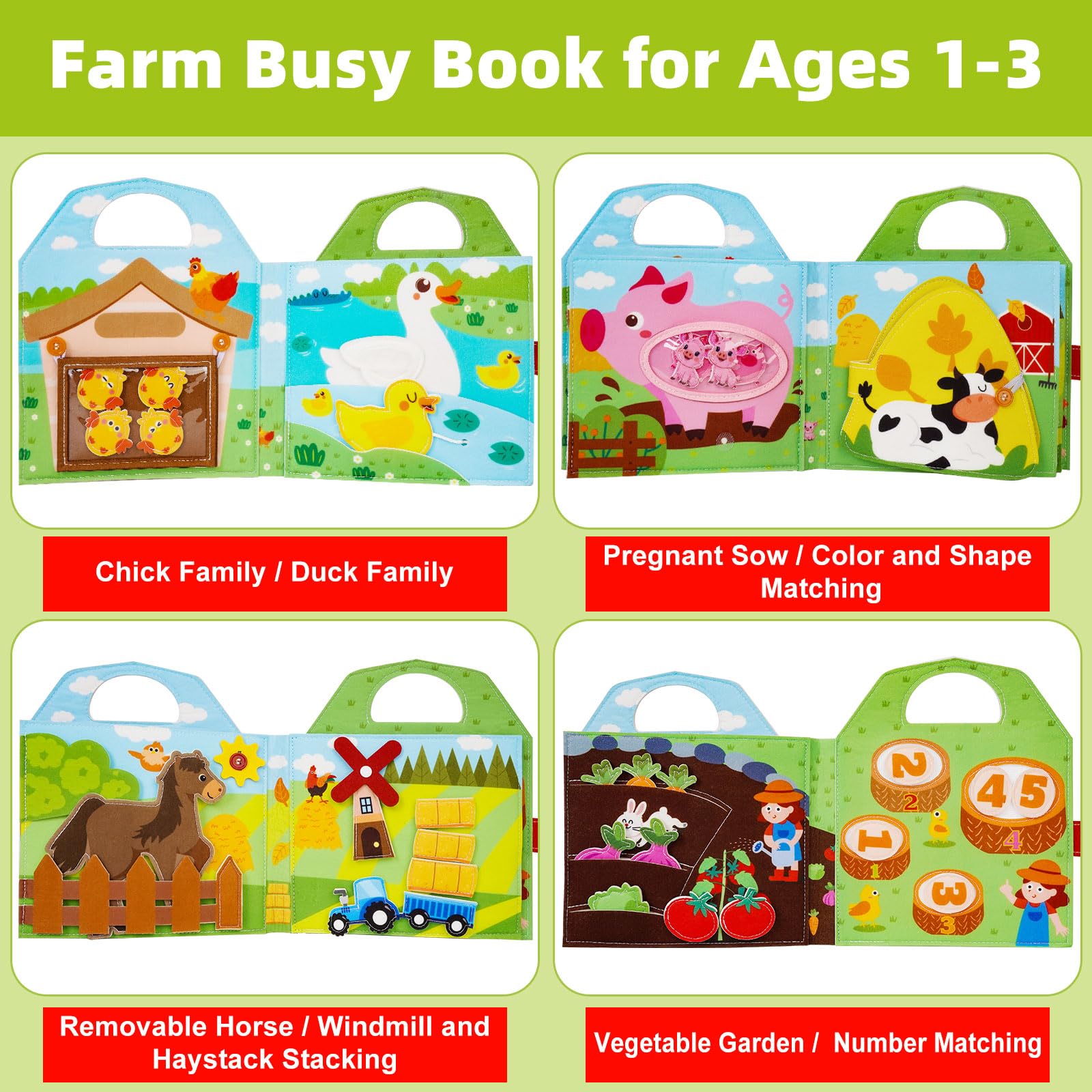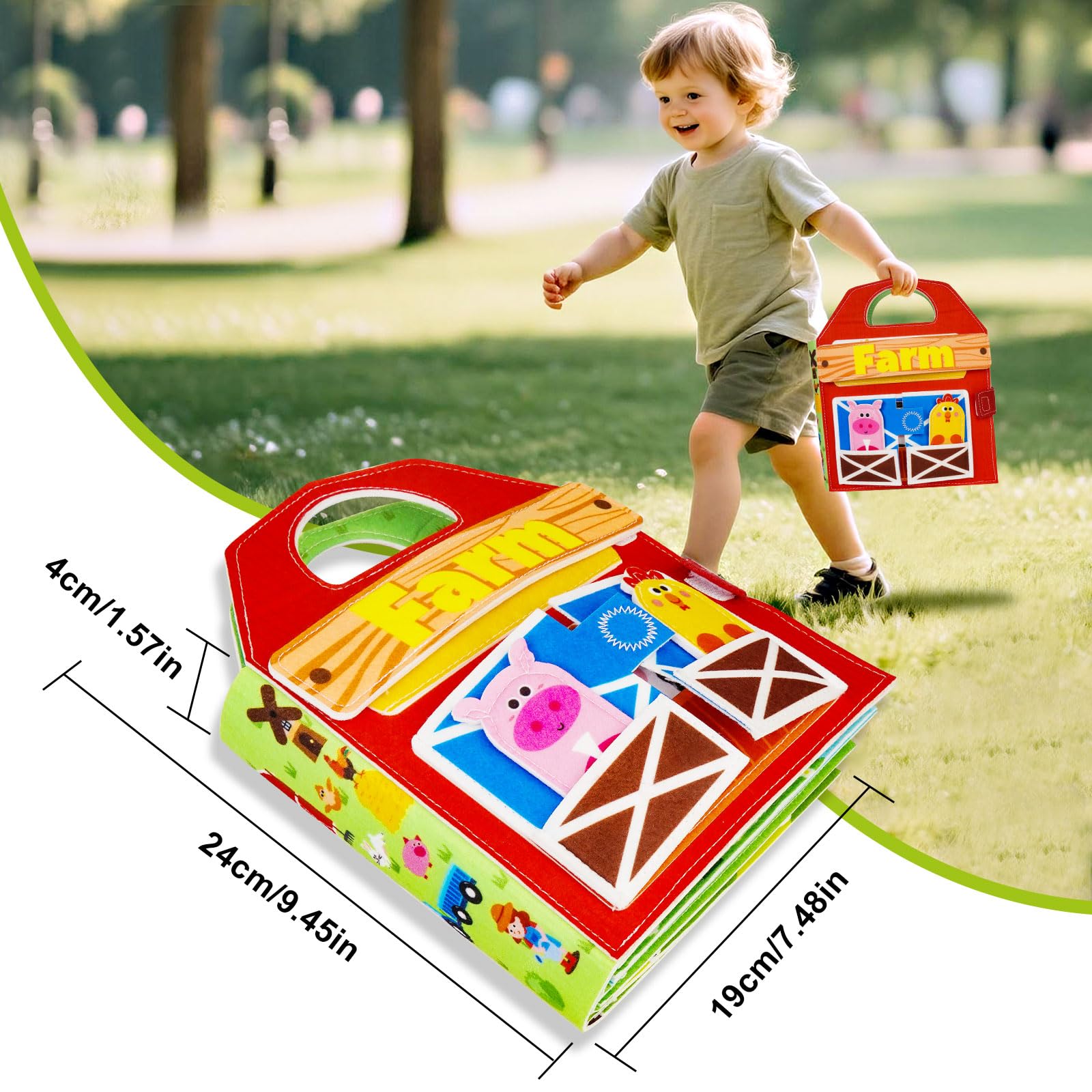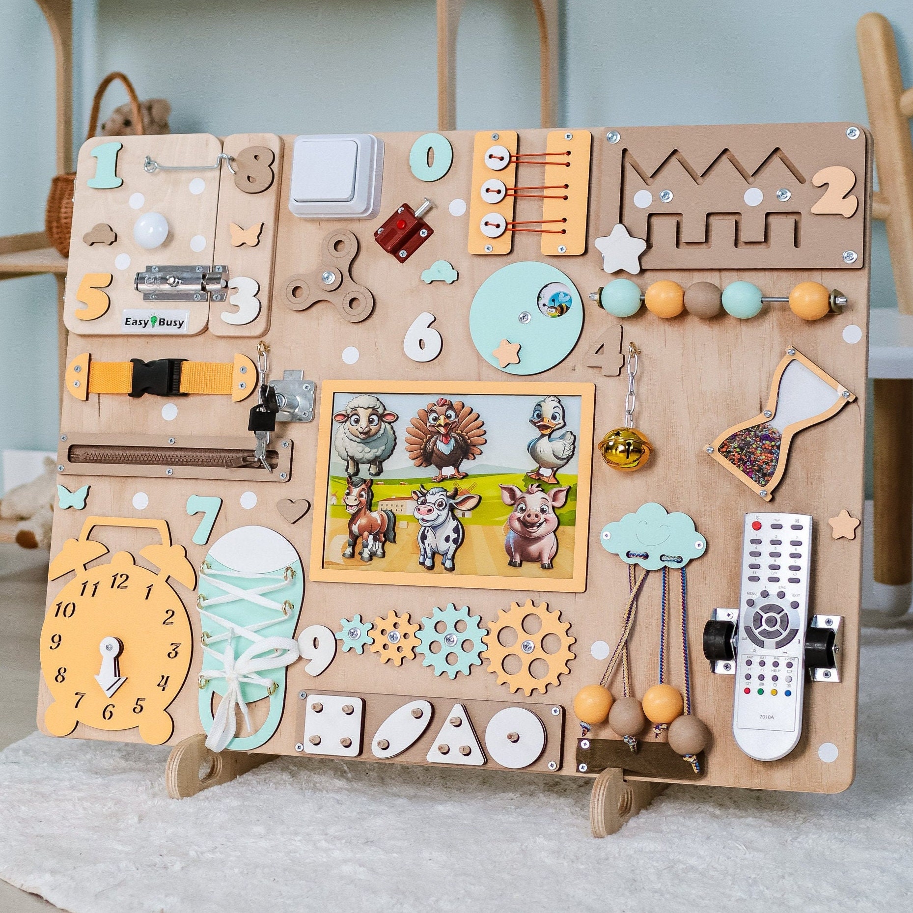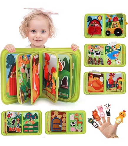 So macht Lernen Spaß! Dieses süße Bauernhof-Busy Board begeistert die Kleinen und fördert sie gleichzeitig. Aus weichem, hochwertigem Filz mit allen möglichen interessanten Elementen: Knöpfe, Schnürsenkel, Reißverschlüsse und vieles mehr. Kinder lernen spielerisch Tiere, Gemüse, Farben und Zahlen kennen. Super für die Entwicklung der Feinmotorik und Hand-Auge-Koordination. Inklusive 4 Aquarellstiften für kreatives Malen. Leicht und mit Reißverschluss zum Zusammenklappen - perfekt für unterwegs, im Auto, im Wartezimmer oder auf Reisen. Macht kaum Lärm, also ideal für ruhige Beschäftigung. Ab 1 Jahr geeignet. Ein tolles Geschenk zu Geburtstag, Weihnachten oder einfach so. Die Kleinen sind stundenlang beschäftigt und lernen dabei ganz nebenbei wichtige Fähigkeiten. Pädagogisch wertvoll und macht einfach riesig Spaß!