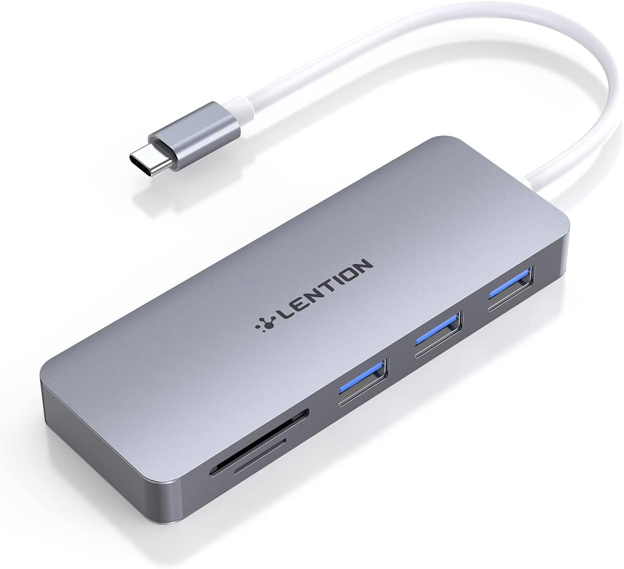 Endlich alle Anschlüsse an einem Ort! Dieser LENTION USB-C Hub verwandelt deinen Laptop in eine echte Arbeitsstation. Mit 4K HDMI für Monitor oder TV, 3x USB 3.0 Anschlüssen für Maus, Tastatur, Festplatten und dualem SD/MicroSD Kartenleser. Super schnelle Datenübertragung mit bis zu 5 Gbit/s. Aus Aluminiumgehäuse im Mac-Design - robust und stylisch. Perfekt für MacBook Pro/Air 2016-2024, iPad Pro, Surface und andere USB-C Geräte. Keine Überhitzung, keine Störungen - dank speziellem 'Stable Driver' System. Kompakt und leicht für unterwegs. Schafft Platz auf deinem Schreibtisch und macht Kabelchaos unmöglich. Dein Laptop kann endlich alles, was er sollte!