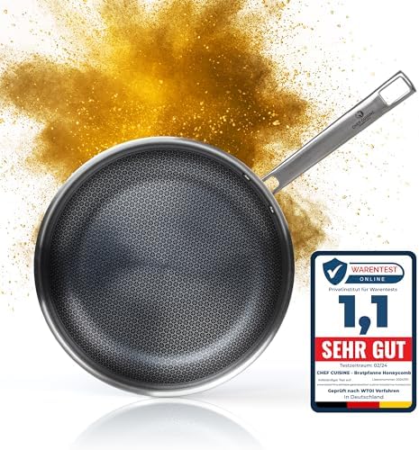 Kochbegeisterte aufgepasst! Diese CHEF CUISINE Wokpfanne bringt Profi-Qualität in deine Küche. Mit 32cm Durchmesser ist sie groß genug für asiatische Gerichte, Pfannengerichte oder knackiges Gemüse. Die spezielle Honeycomb-Struktur sorgt für perfekte Wärmeverteilung und super Antihaft-Effekt - nichts brennt mehr an! Der Aluminiumkern speichert die Hitze optimal, sodass du auch bei mittlerer Temperatur scharf anbraten kannst. Besonders praktisch: Die Pfanne ist ofenfest bis 260°C und für alle Herdarten geeignet - ob Induktion, Gas oder Ceran. Das coole Design mit dem Löwenkopf im Boden macht sie zum echten Hingucker in deiner Küche. Die Edelstahlgriffe sind fest vernietet und bleiben auch beim Schwenken kühl. Du kannst sogar Metallutensilien verwenden ohne die Beschichtung zu beschädigen. Spülmaschinengeeignet natürlich! Perfekt für alle die gerne asiatisch kochen, scharf anbraten oder einfach eine vielseitige Pfanne suchen die alles kann. Ob gebratene Nudeln, Reisgerichte oder saftiges Fleisch - mit diesem Wok gelingt alles. Ein Must-Have für jede Küche die was hermacht!