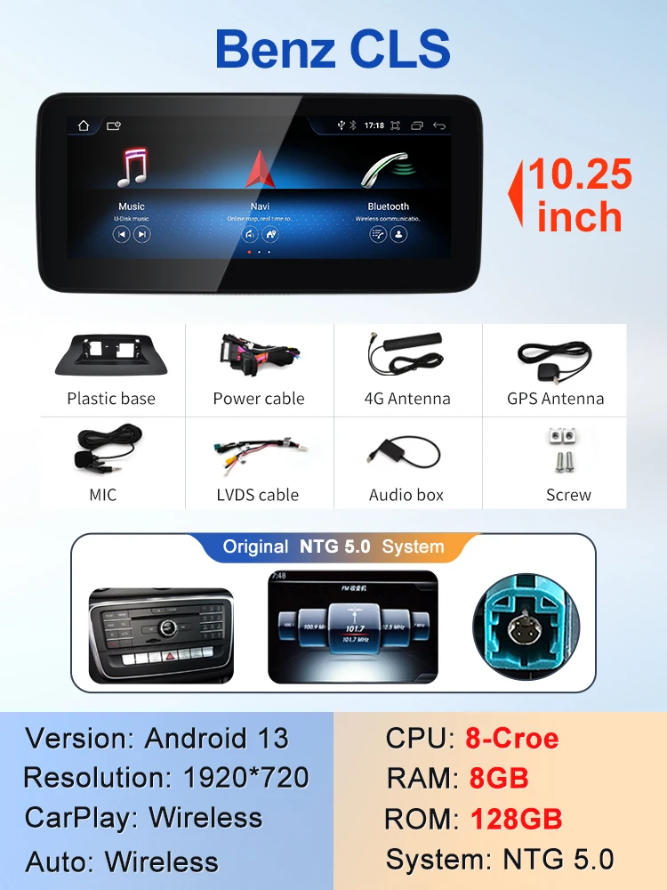 Upgrade dein Mercedes CLS W218 Infotainment! Dieses 10,25 Zoll Android Radio mit Android 14 bringt modernste Technik in dein Auto. Mit 8-Core Prozessor und 8GB RAM + 128GB ROM läuft alles butterweich. Wireless CarPlay und Android Auto - kein Kabelsalat mehr! Kapazitiver IPS-Touchscreen mit 1920x1080 Auflösung für gestochen scharfe Bilder. Integriertes GPS, 4G/5G, WiFi, Bluetooth - alles dabei. Kompatibel mit Lenkradsteuerung, Rückfahrkamera und originalen Funktionen. Plug-and-Play Installation, kein zusätzlicher Rahmen nötig. Hol dir das Multimedia-Erlebnis, das dein CLS verdient - bestell jetzt das Upgrade!