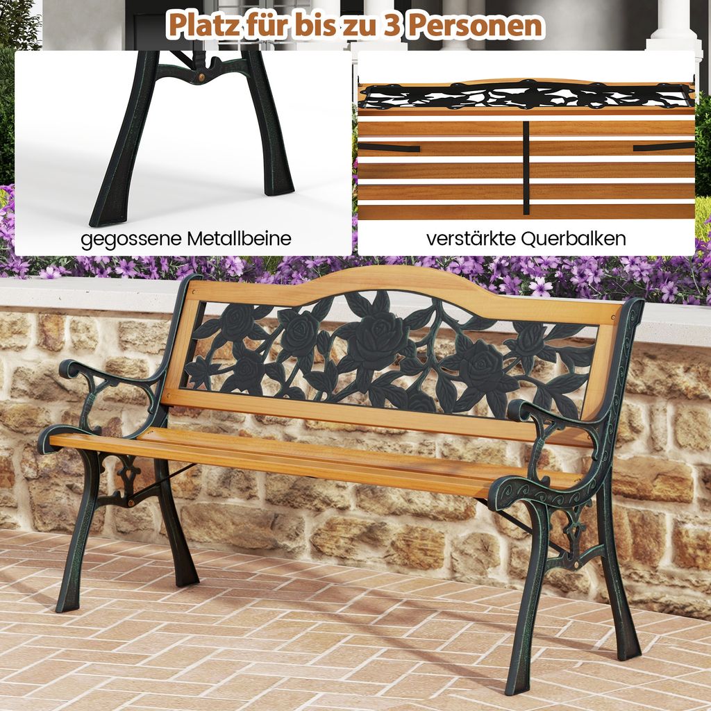 Entspannen war noch nie so schön! Diese COSTWAY Gartenbank bietet Platz für 2-3 Personen und ist ein echter Hingucker in jedem Garten. Aus lackiertem Gusseisen und massivem Kiefernholz - extrem stabil und wetterfest. Tragkraft bis 210kg! Maße: 126x52x74cm. Mit bequemen Armlehnen und Rückenlehne für maximalen Komfort. Die Edelstahl-Verbindungen sind rostbeständig und langlebig. Alle Kanten abgerundet für maximale Sicherheit. Schlichter Design passt zu jeder Einrichtung. Perfekt für Garten, Terrasse, Balkon oder Veranda. Einfache Montage - inklusive Anleitung. Mach dir eine Pause und genieße die frische Luft auf dieser qualitativ hochwertigen Bank!