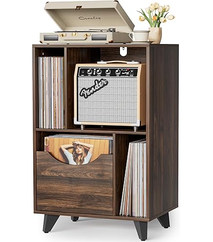 Vinyl-Liebhaber, aufgepasst! Endlich ein Regal, das deine Plattenspieler und Schallplatten würdevoll präsentiert. Mit 4 speziellen Fächern für deine Vinyl-Sammlung - alles schön organisiert und griffbereit. Oben plenty Platz für deinen Plattenspieler und Zubehör, plus 2 offene Fächer für Bücher oder Deko. Die 5 Metallbeine geben bombenfesten Halt, selbst für schwere Equipment. Mit Kippsicherung - nichts wackelt oder fällt um. Maße: 100x40x74,5cm, also kompakt aber geräumig. Aus stabilem Spanplatte und MDF, hält bis zu 40kg auf der Oberseite aus. Montage nötig, aber mit Anleitung machbar. Sieht super aus im Wohnzimmer oder Musikzimmer - praktisch und stylisch zugleich. Deine Schallplatten verdienen doch was Besseres als irgendein x-beliebiges Regal, oder?