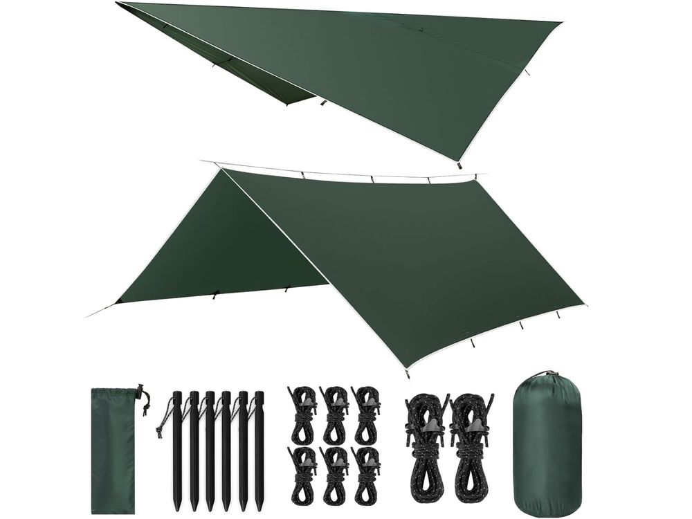 Für echte Outdoor-Fans! Diese Camping-Plane ist absolut wasserdicht mit PU3000 Beschichtung und hat UPF30 Sonnenschutz. Maße: 305x293cm (wie 3x3m) mit 19 verstärkten Ösen für super flexible Aufbauten. Im Set: 6 Aluminium-Erdnägel und 6 verstellbare Leinen. Wiegt nur 1150g - packt klein auf 36x14x14cm. Ob als Zeltdach, Hängematten-Schutz oder Picknick-Unterstand - dich hält nichts nass! Ein Jahr Garantie gibt's obendrauf.