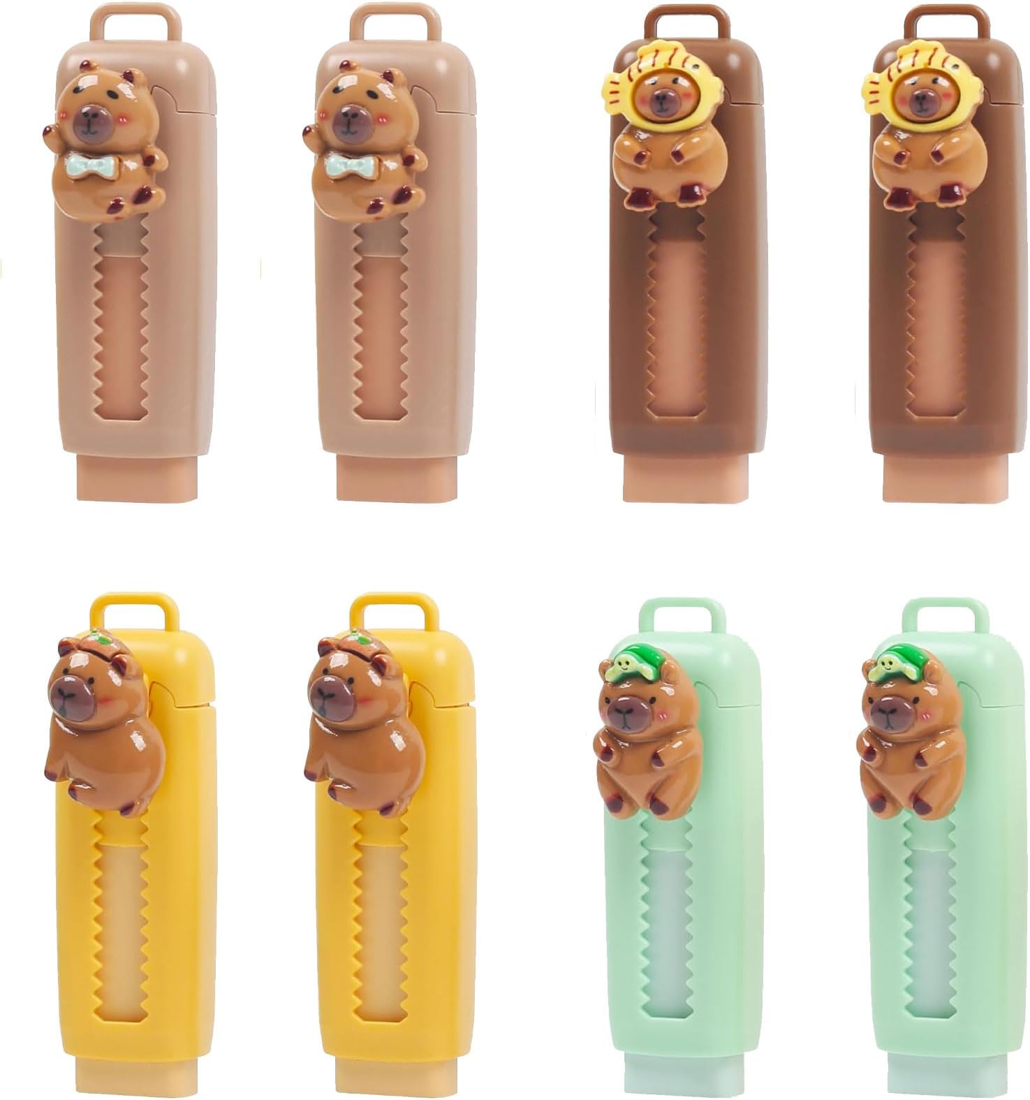 Wie niedlich sind denn diese Radiergummis? Im Capybara-Design sind sie nicht nur super praktisch, sondern auch noch total süß! Das Set enthält 4 einziehbare Radiergummis in verschiedenen Farben (grün, gelb, hellbraun, dunkelbraun). Durch das Push-Pull-Design kannst du die Länge einfach anpassen - so nutzt du den Radiergummi optimal und er bleibt immer sauber. Mit ca. 8,2 cm Größe passen sie perfekt in jedes Federmäppchen. Aus ungiftigem Gummi und mit hochwertiger Kunststoffhülle sind sie ideal für Schule, Büro oder kreative Malprojekte. Besonders bei Kindern kommen die niedlichen Tier-Motive super an und machen sogar das Hausaufgaben-Machen etwas spaßiger! Ein tolles Mitbringsel oder Geschenk für kleine und große Künstler.
