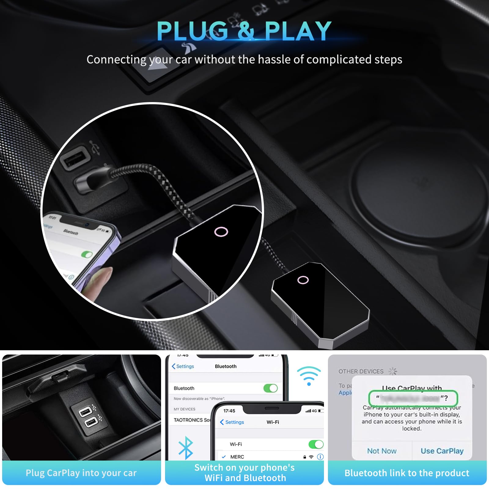 Endlich kabellos fahren! Dieser CarPlay Adapter macht Schluss mit lästigen Kabeln im Auto. Einfach in den USB- oder Type-C-Anschluss stecken und sofort verbunden. Mit dem A7 Chip und Bluetooth 5.2 für superschnelle, stabile Verbindung - keine Verzögerung bei Musik, Navigation oder Anrufen. Kompatibel mit allen Autos, die kabelgebundenes CarPlay unterstützen und iPhones ab iOS 10. Das kompakte Design nimmt kaum Platz weg und ist immer einsatzbereit. Genieße nahtloses Streaming, klare Telefonate und intuitive Siri-Steuerung. Perfekt für alle, die Wert auf Komfort und Sicherheit beim Fahren legen. Plug & Play - keine komplizierte Einrichtung nötig. Mach dein Fahrerlebnis moderner und entspannter!