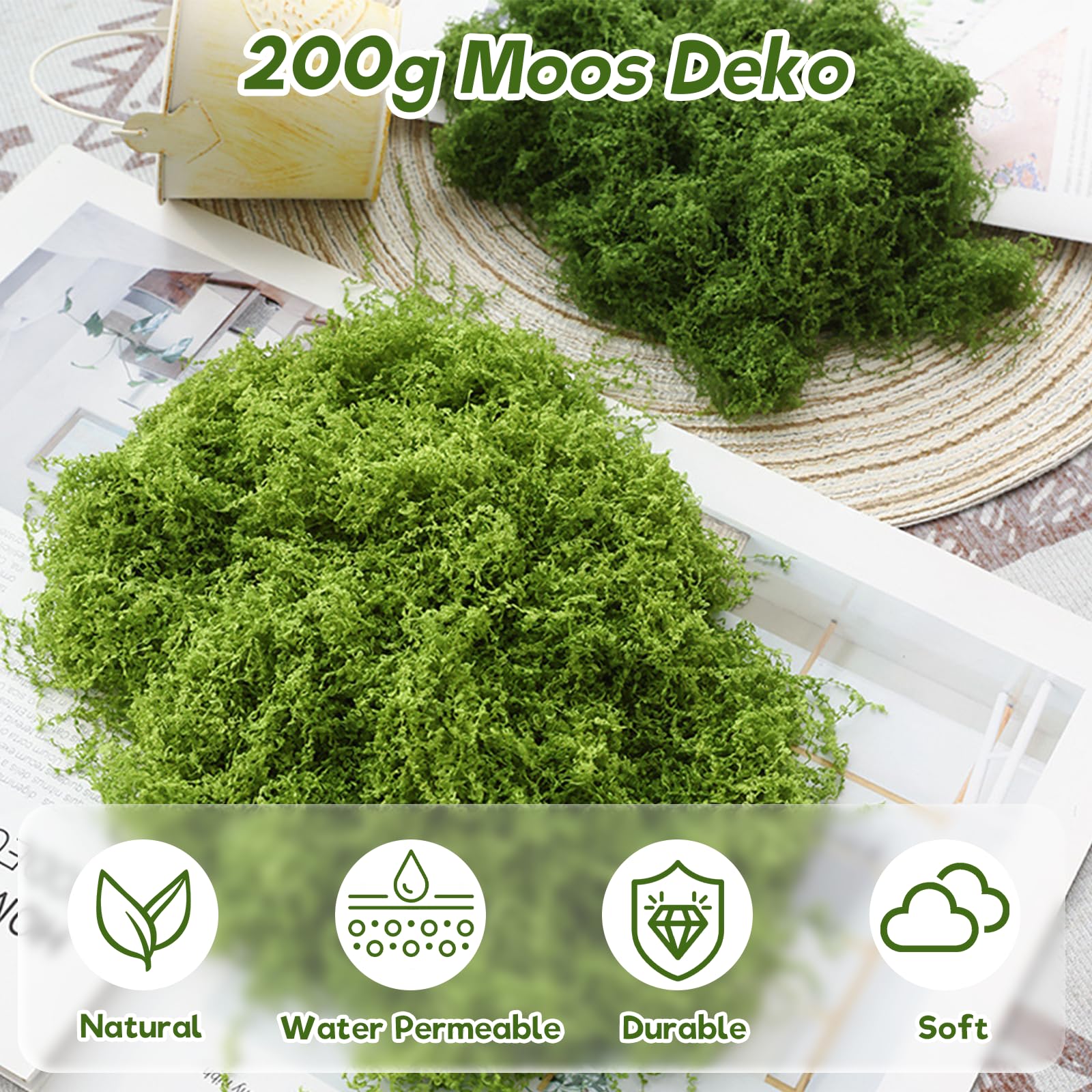 Bring Natur in dein Zuhause - ohne grünen Daumen! Dieses 200g Kunstmoos-Set mit je 100g dunkelgrünem und 100g hellgrünem Moos ist der perfekte Helfer für alle Bastelprojekte. Das Moos sieht täuschend echt aus und fühlt sich weich und flauschig an. Aus hochwertigem Nylon gefertigt, ist es atmungsaktiv und wasserdurchlässig - perfekt auch für Topfpflanzen als Verdunstungsschutz. Du kannst es einfach auf die Erde legen oder für deine Bastelprojekte verwenden. Ob für Weihnachtskrippen, Osterdekoration, Hochzeitsarrangements oder Aquarien - dieses Moos ist super vielseitig. Es verblasst nicht im Wasser und kann sowohl drinnen als auch draußen verwendet werden. Das Beste: Es benötigt absolut keine Pflege! Kein Gießen, kein Düngen, kein Licht. Einfach in Form ziehen und dekorieren. Perfekt für Moosbilder, -wände, -kränze oder als Tischdeko. Deiner Kreativität sind keine Grenzen gesetzt mit diesem praktischen Moos-Set!