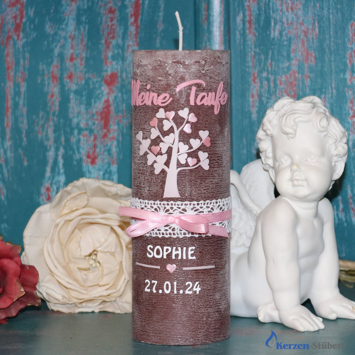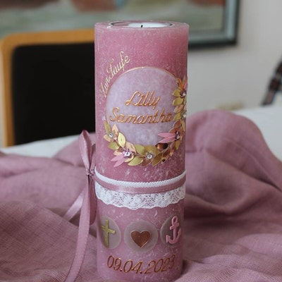 Eine ganz besondere Erinnerung an den Tauftag! Diese wunderschöne Taufkerze wird von unserem neunköpfigen Team mit viel Liebe und Sorgfalt handverziert. Du kannst sie komplett individualisieren - wähle zwischen klassischem Docht oder Glasteelichteinsatz, entscheide dich für silberne oder goldene Schrift, und gib den Namen des Täuflings sowie das Taufdatum an. Die Kerze in Rustik Creme (19x6,8 cm) wird mit hochwertigen Materialien nach RAL-Standard gefertigt. Die Verzierung in rosa, taupe und weiß macht jedes Stück zum Unikat. Kleine Änderungswünsche? Kein Problem - wir freuen uns auf deine Anfrage! Übrigens: Passende Taufspruch-Karten und Kerzenteller findest du bei Amazon unter 'christ-kerzen Taufspruch' und 'christ-kerzen Kerzenteller'. Jede Kerze ist ein Einzelstück - made with love!