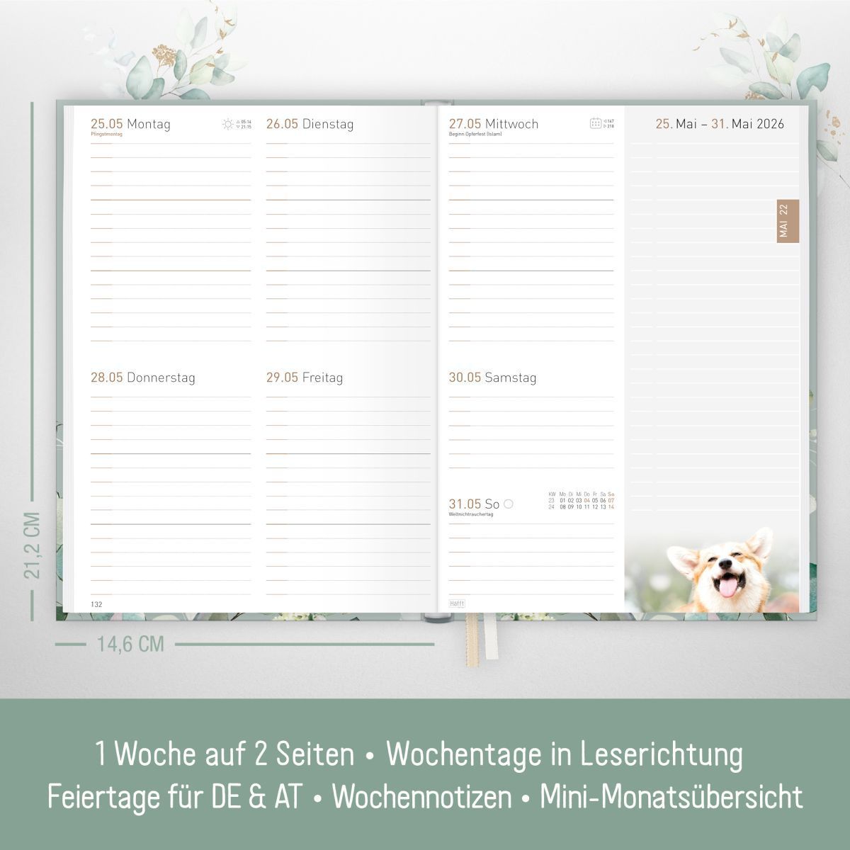 Starte organisiert ins Jahr 2026! Der beliebte Häfft Chäff-Timer im praktischen A5 Format ist dein perfekter Begleiter für das nächste Jahr. Mit dem wunderschönen Wild Blossoms Design macht Planen gleich doppelt Spaß. Auf 176 Seiten findest du alles, was du brauchst: Wochenkalender mit je einer Woche pro Doppelseite, Monatsübersichten, To-do-Listen und viele praktische Extras wie Urlaubsplaner, Mood-Tracker und Notizseiten. Die zwei Lesebänder helfen dir, schnell die richtige Seite zu finden. Jetzt mit stärkerem 100g/m² Papier für noch besseres Schreibgefühl. FSC-zertifiziert und klimafreundlich gedruckt - Planen mit gutem Gewissen! Die stabile Fadenheftung garantiert Langlebigkeit. Ob für Schule, Studium oder Beruf - mit diesem Kalender behältst du garantiert den Überblick über alle Termine und Aufgaben.