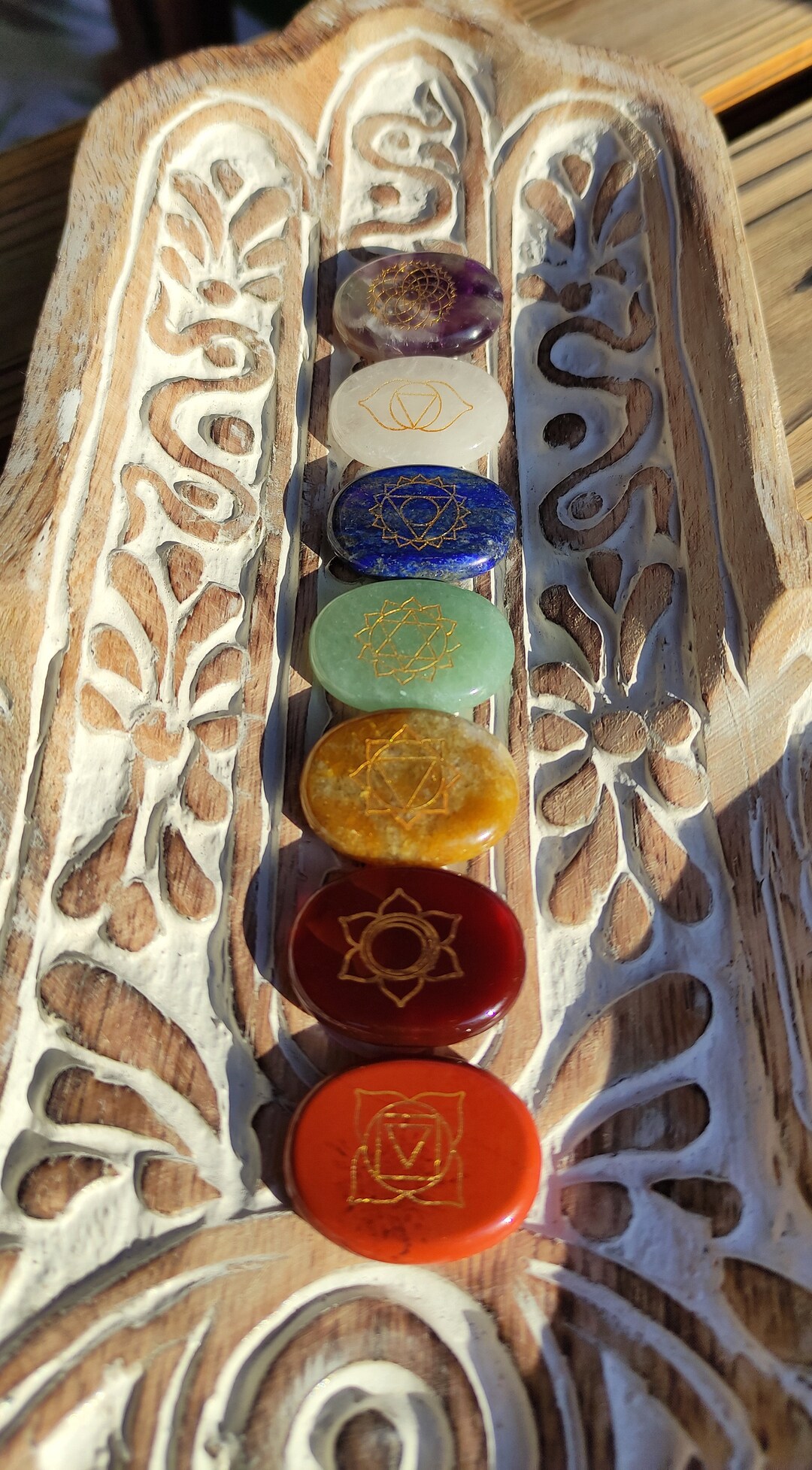Entdecke die Kraft der Steine! Dieses vollständige 7-Chakra-Set bringt Körper, Geist und Seele in Einklang. Enthält Amethyst, Bergkristall, Lapislazuli, Roter Jaspis, Aventurin, Gelbe Jade und Roten Achat. Jeder Stein hat ein golden graviertes Chakra-Symbol - einfach wunderschön! Hochwertig poliert, jede Maserung einzigartig. Perfekt für Meditation, Energiearbeit oder als Handschmeichler. Auch als Deko für Zuhause super. Ein tolles Geschenk für alle, die Spiritualität und innere Ruhe suchen!
