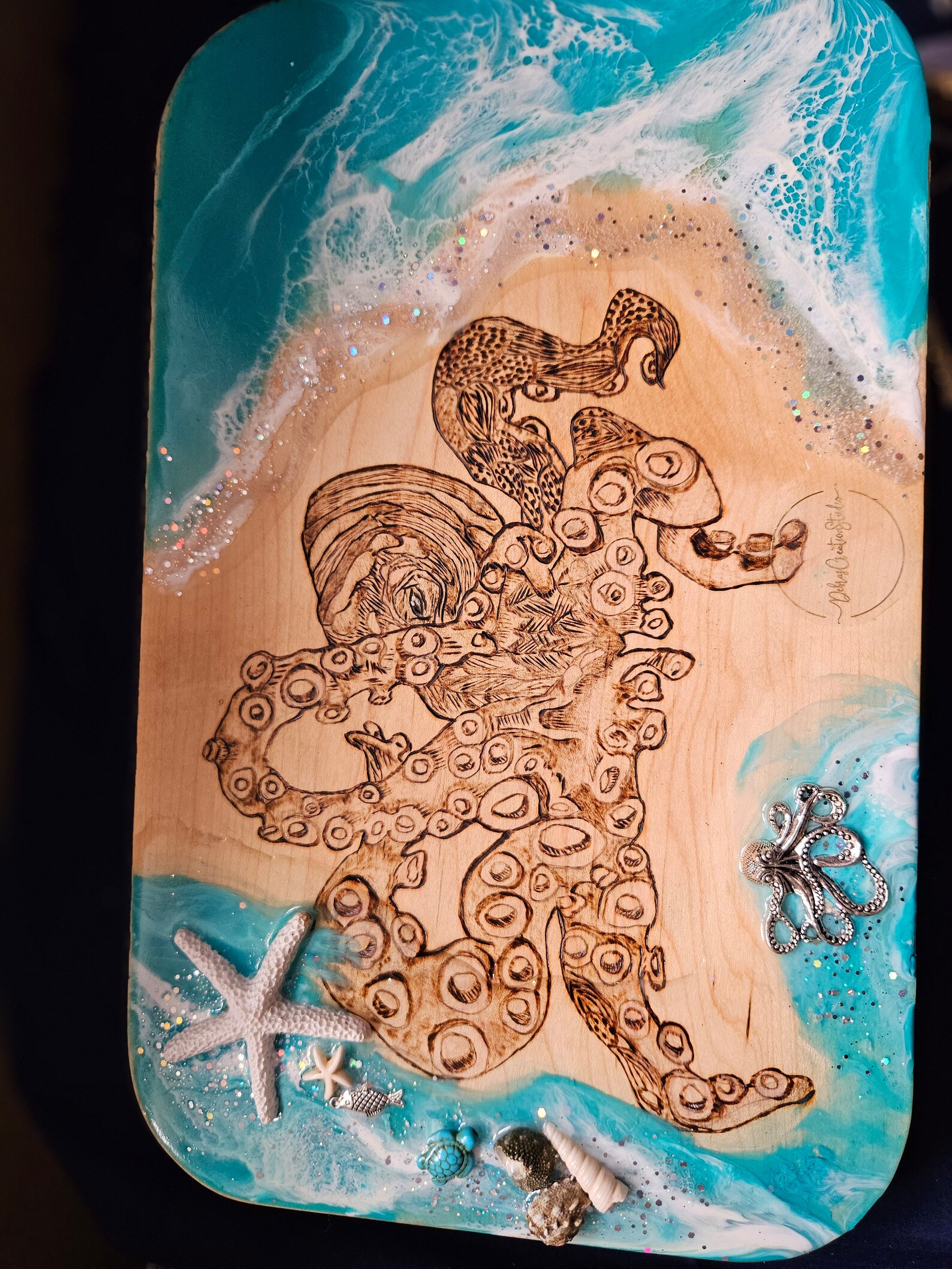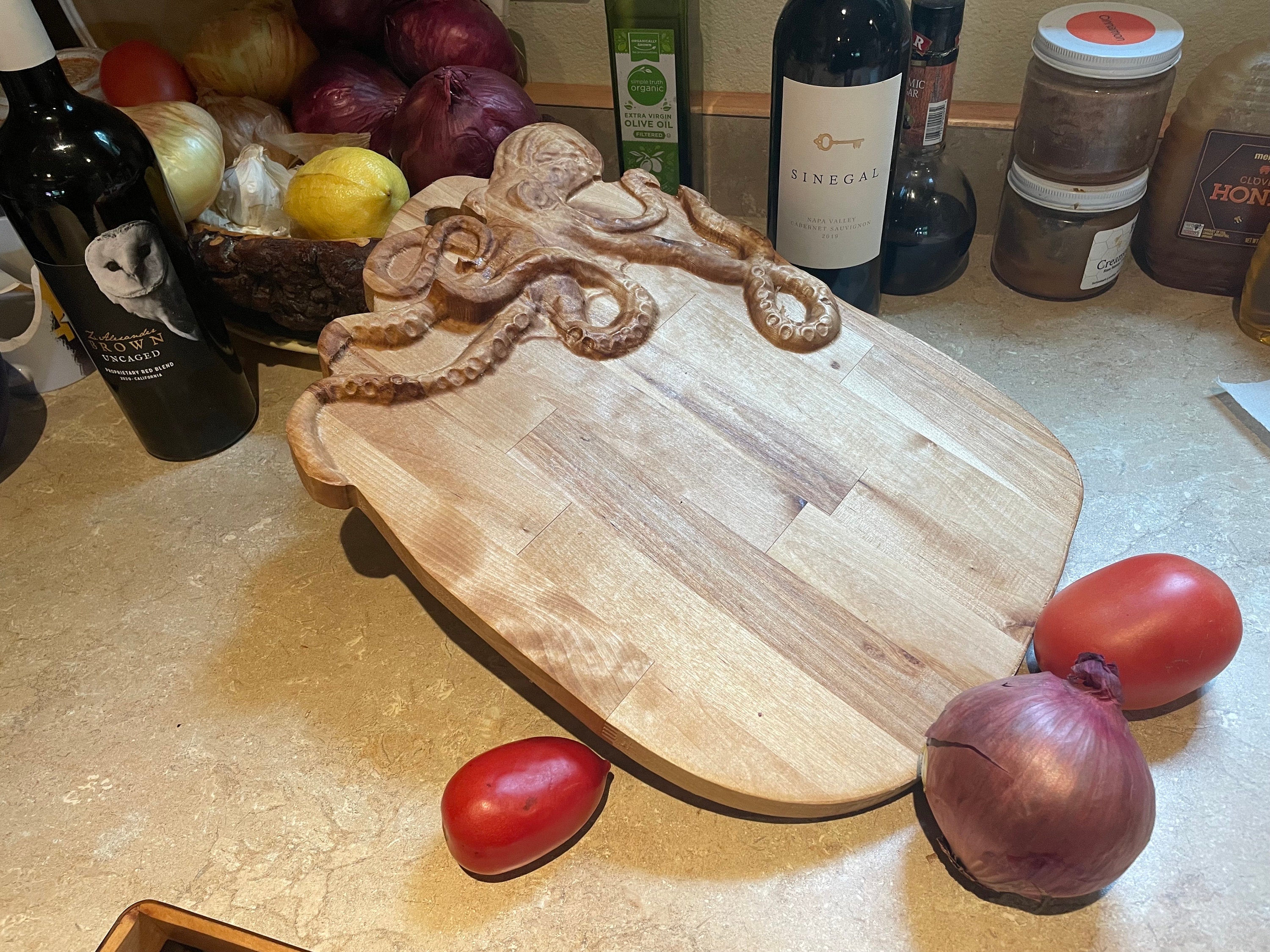 Wow, dieses Oktopus-Servierbrett ist ein absoluter Hingucker! In Tintenfisch-Form aus massivem Holz gefertigt, mit filigranen Tentakel-Motiven - einfach kunsthandwerklich schön! Mit ca. 28x28cm Größe perfekt für Käse, Aufschnitt, Meeresfrüchte oder Obst. Super für Partys, Picknicks oder als stylische Deko in der Küche. Das natürliche Holz verleiht jedem Anlass rustikalen Charme und ist leicht zu reinigen. Ob als Servierplatte, Schneidebrett oder dekoratives Element - dieses Unikat macht immer was her! Perfekt für Gastgeber, Meeresmotiv-Liebhaber oder alle, die besondere Accessoires schätzen. Einfach belegen und deine Gäste werden begeistert sein!