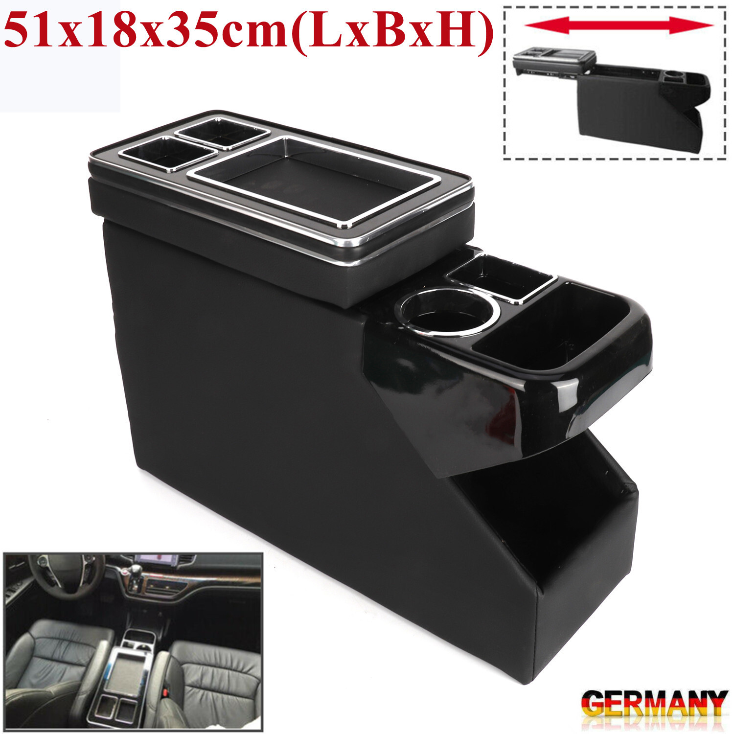 Endlich Ordnung im Auto! Diese Mittelkonsole füllt die Lücke zwischen den Sitzen und schafft jede Menge Stauraum. Mit 43x23,5x21 cm passt sie in die meisten Limousinen, SUVs und Pick-ups.
