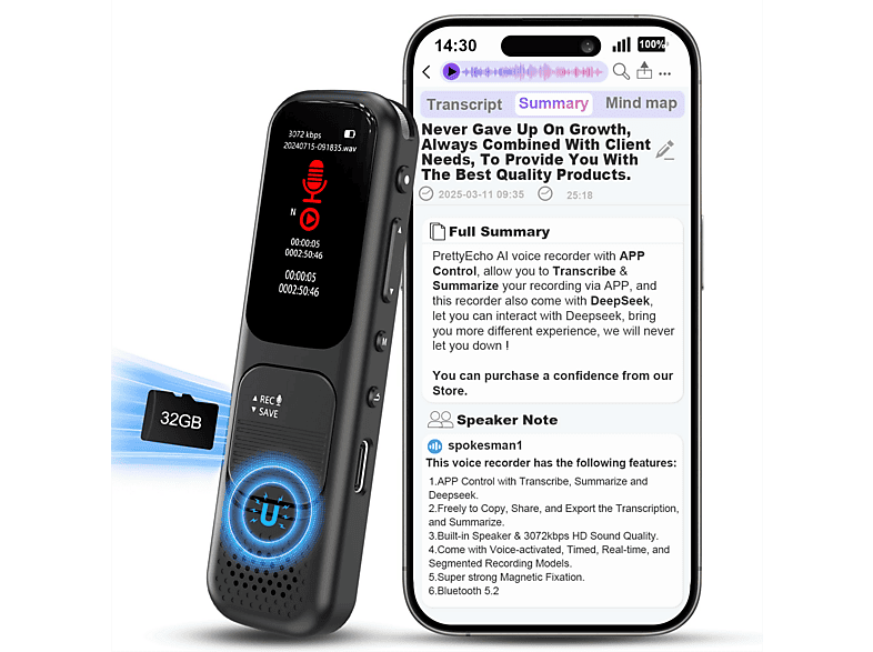 Das Gerät ist nur 3mm dick und wiegt kaum was - 27g! Mit dem Magnetring klebst du es einfach an deine Handyhülle und hast es immer dabei. Die App für iOS und Android gibt dir volle Kontrolle über Aufnahmen, Transkription und KI-Analyse.