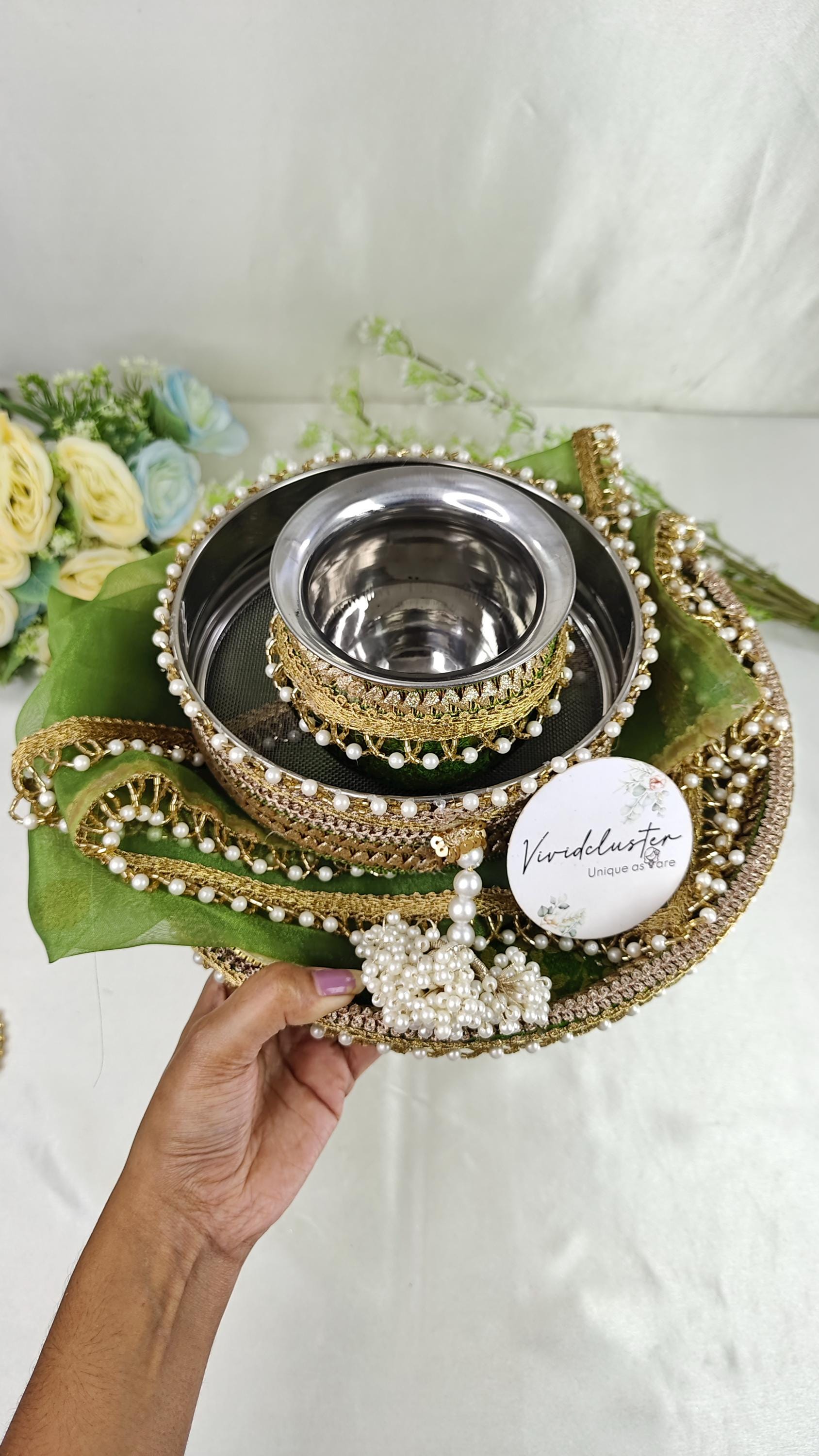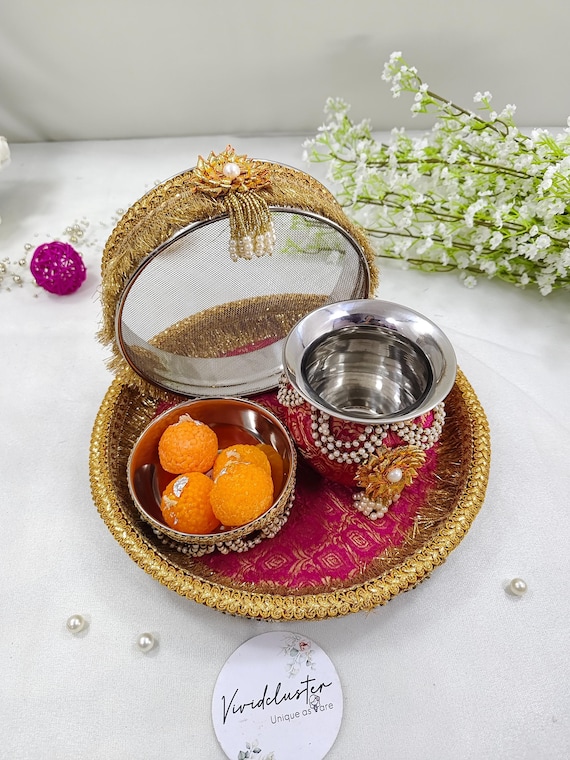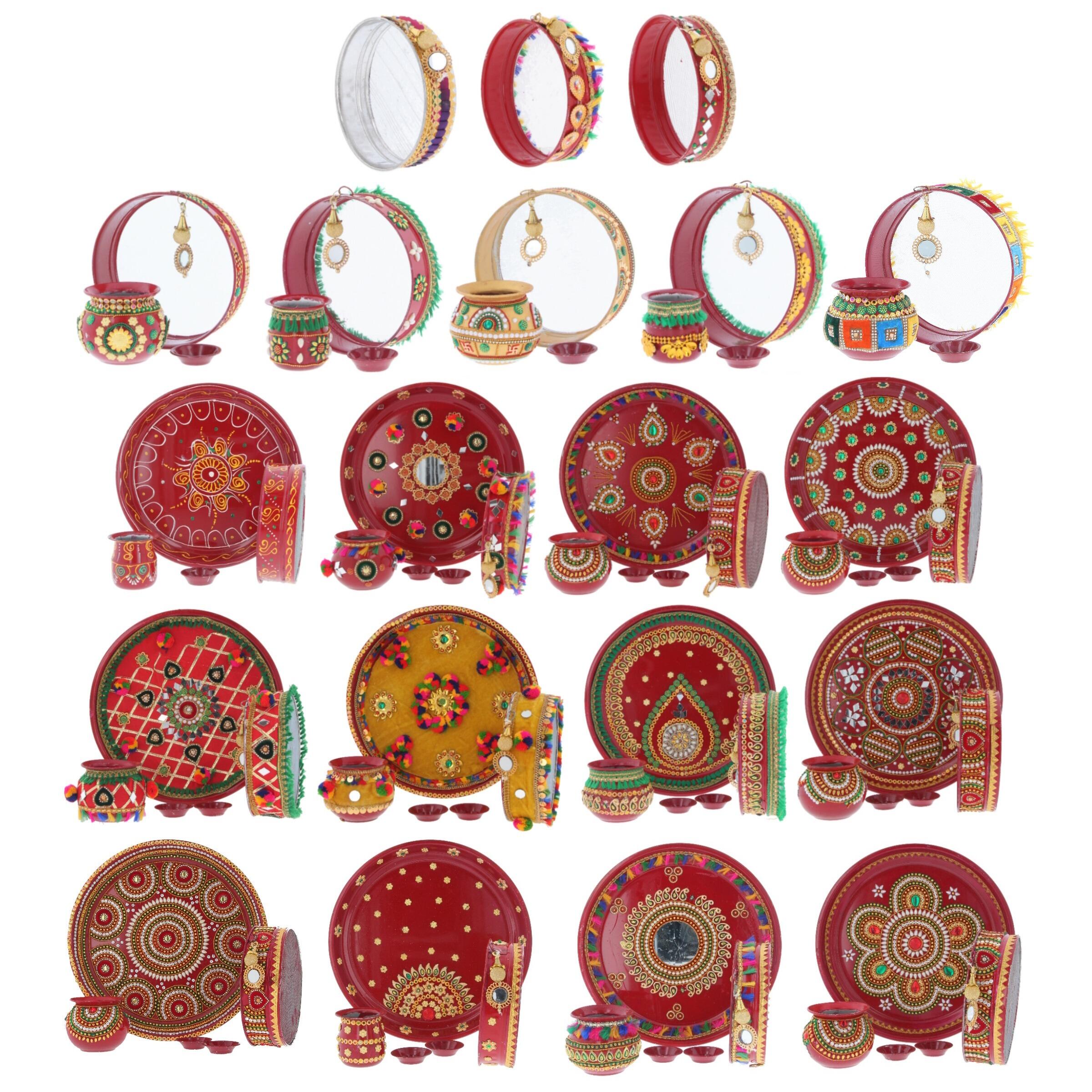 Diese wunderschön handgefertigte Pooja Thali ist ein absolutes Meisterwerk! Komplett-Set mit allem was du für deine Rituale brauchst: 1 Thali (Hauptteller), 1 Diya (Öllampe), 2 Schälchen für Kumkum und Haldi, 1 Channi (Sieb) und 1 Kalash (Wassergefäß). In strahlenden Pink- und Grüntönen mit aufwändiger Meenakari-Arbeit verziert - einfach atemberaubend! Jedes Set ist ein Unikat, handgefertigt von indischen Kunsthandwerkern. Perfekt für Karwa Chauth, Diwali, Hochzeiten oder Haussegnungen. Du kannst alle Puja-Utensilien schön arrangiert darauf präsentieren - sieht nicht nur praktisch aus, sondern auch super dekorativ! Als Geschenk ideal: Für Töchter, Schwiegertöchter oder frisch verheiratete Paare. Einfach mit einem trockenen Tuch reinigen - kein Aufwand! Hol dir ein Stück traditionelle indische Handwerkskunst nach Hause - für besondere Momente und festliche Anlässe!