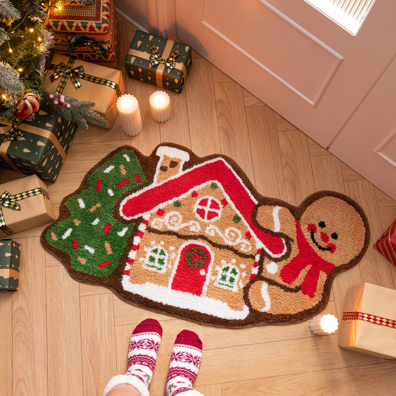 Oh, wie süß! Dieser Christmas Doormat mit Gingerbread House Design bringt weihnachtliche Stimmung direkt vor deine Tür. Mit 60x40 cm Größe ist er perfekt für Eingangsbereich, Terrasse oder auch innen für Küche und Bad. Das kuschelige Kunstfell ist super weich und angenehm unter den Füßen, während die anti-rutsch Unterseite für sicheren Halt sorgt. Das niedliche Lebkuchenhaus-Motiv macht einfach gute Laune und läutet die Weihnachtszeit ein. Aus robustem Material das auch bei viel Laufverkehr hält - und easy zu reinigen ist. Perfekt um Besuchern ein warmes Willkommen zu bereiten oder einfach um dein Zuhause festlich zu dekorieren. Macht sich auch super als Geschenk für Freunde und Familie! Einfach ausrollen und sofort weihnachtliche Stimmung genießen - der ideale Begleiter für die besinnliche Zeit!