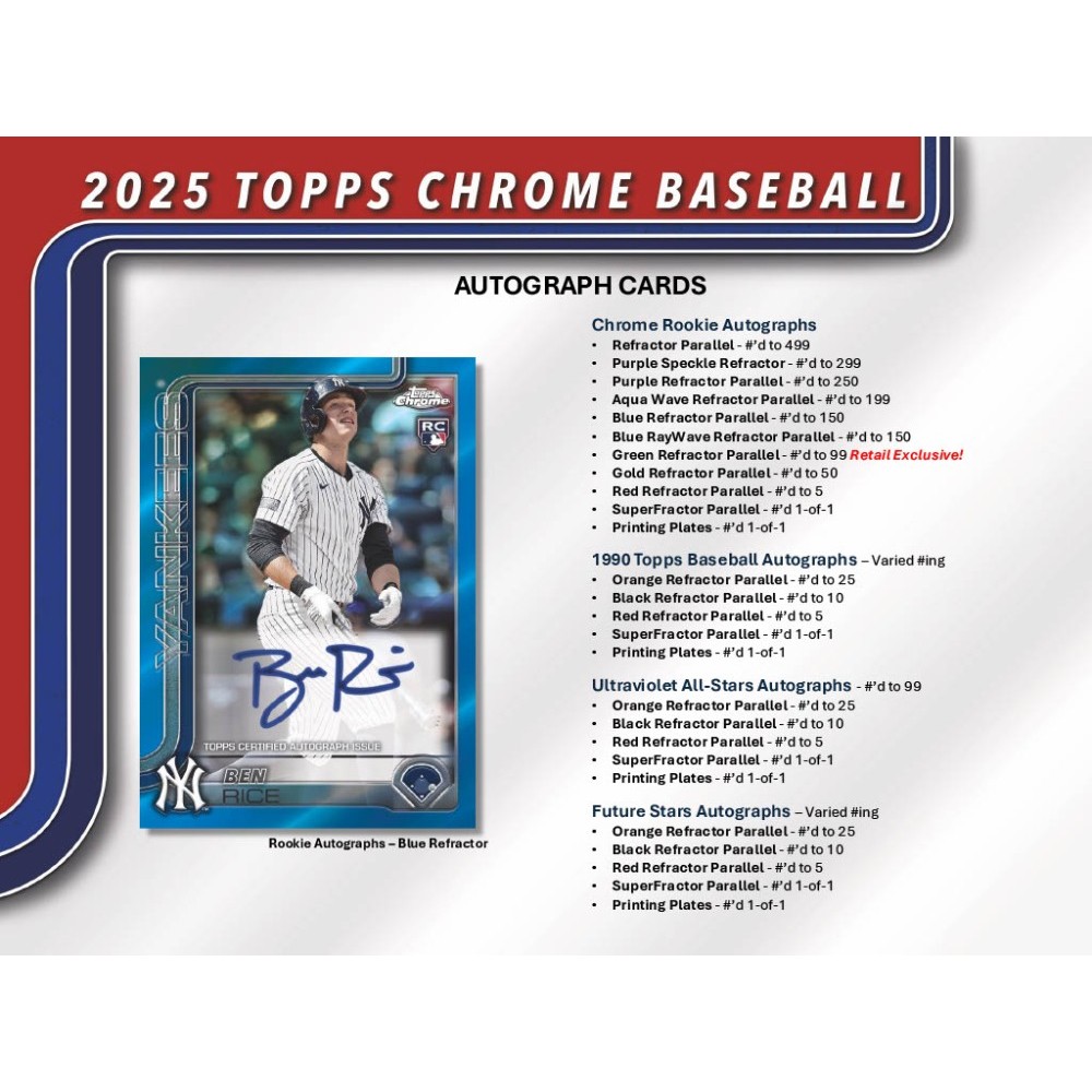 Baseball-Fans aufgepasst! Die 2025 Topps Chrome Baseball Mega-Box ist da - mit den heißesten Rookies und Superstars der Saison! Jede versiegelte Box enthält 7 Packungen mit je 6 Karten - insgesamt 42 Karten pro Box. Enthalten sein können Basis-Karten, spezielle Inserts, Parallelen und sogar handsignierte Karten! Sammle das komplette 300-Karten Base-Set mit Spielern wie Shohei Ohtani, Juan Soto und Dylan Crews. Besondere Highlights: Rookie Rush, Chrome All-Etch und Future Stars Inserts. Auch Autogramm-Karten von Top-Spielern sind möglich! Perfekt für Sammler, die nach Team-Sets, Rookie-Karten oder speziellen Parallel-Versionen jagen. Ob für dich selbst oder als Geschenk für Baseball-Begeisterte - diese Box bietet Spannung und Sammelspaß pur!